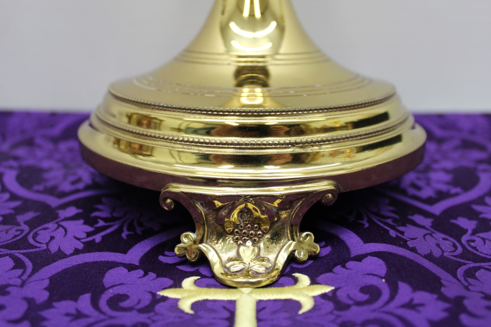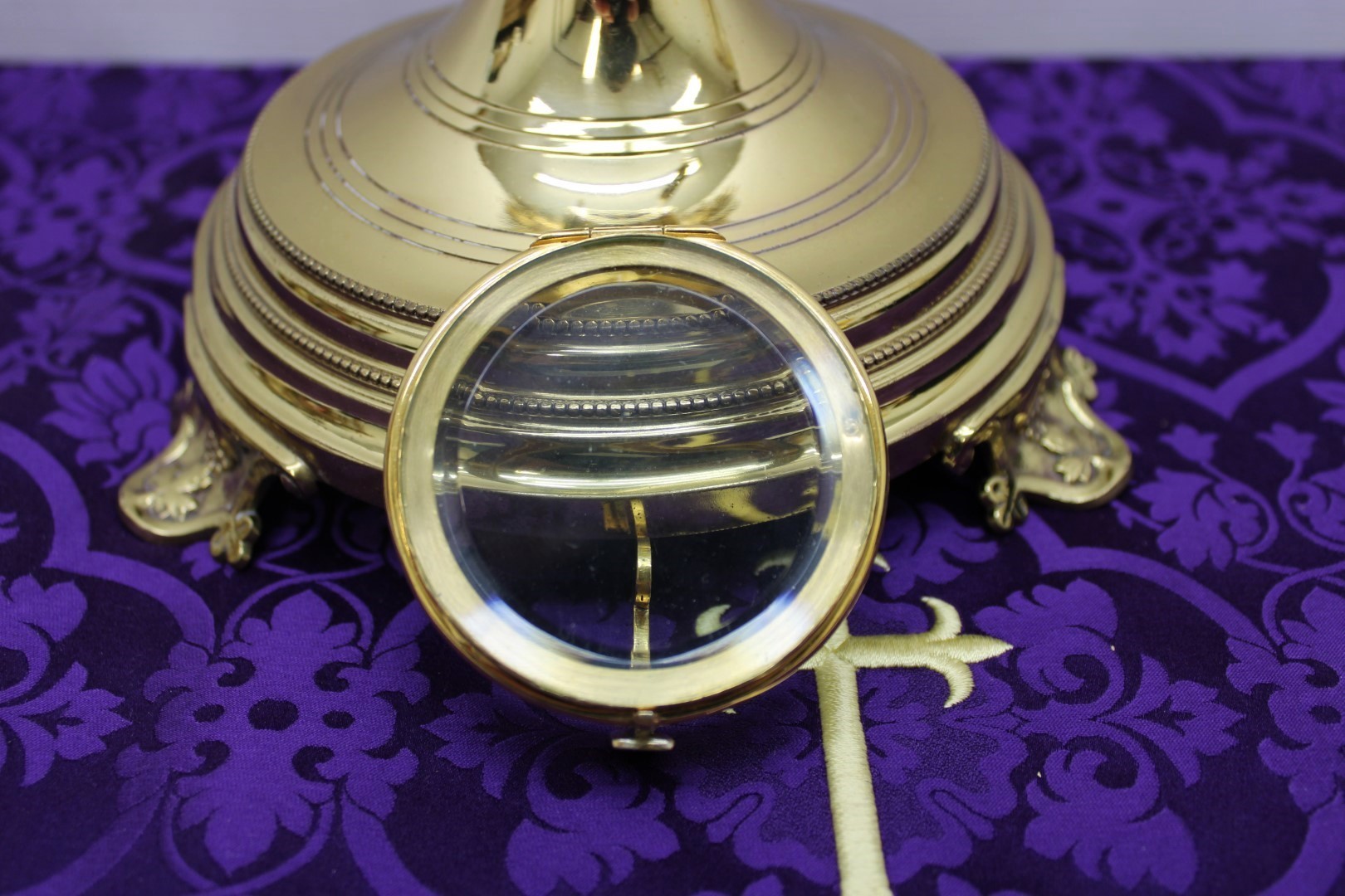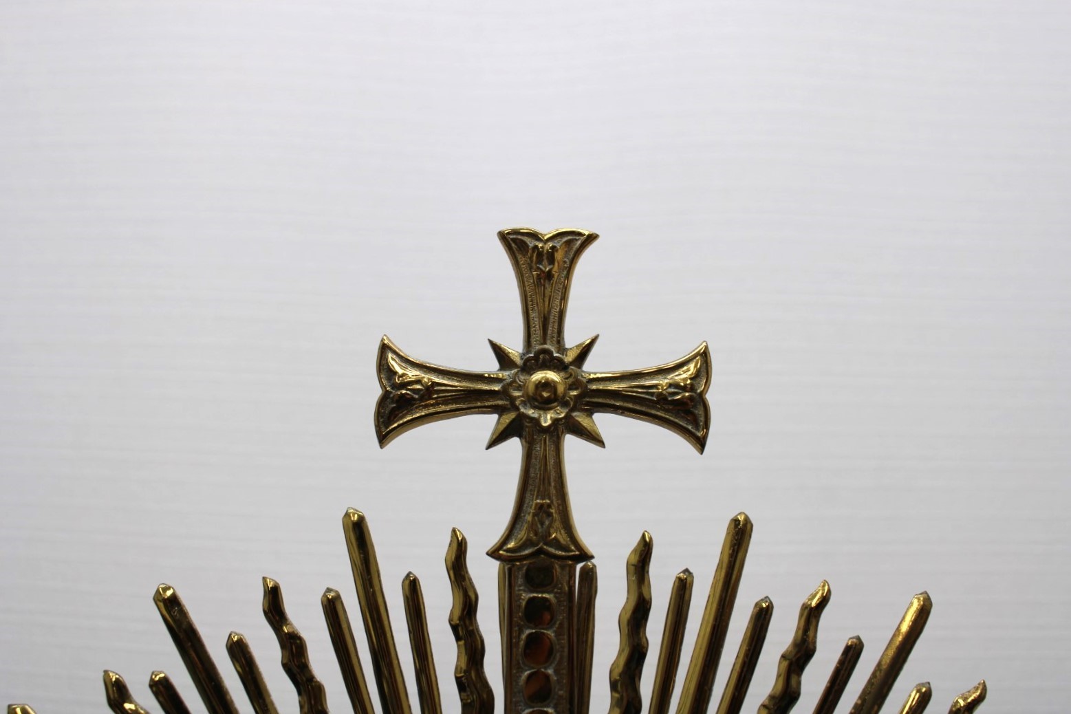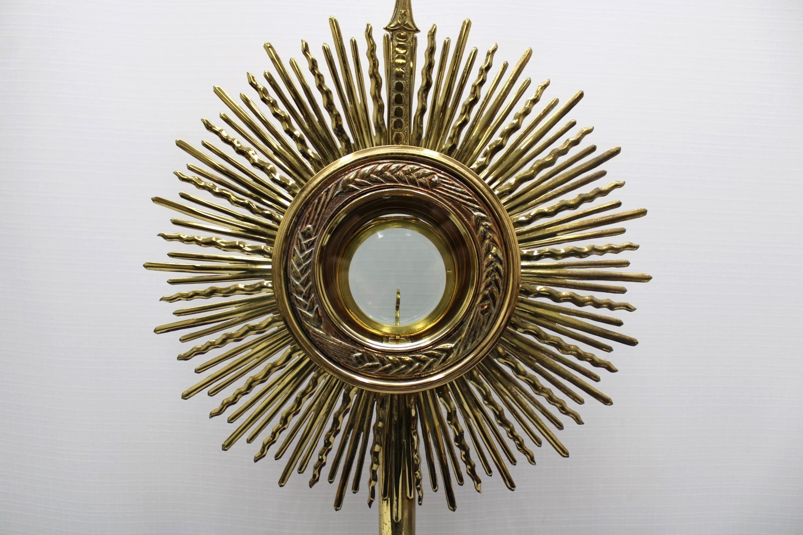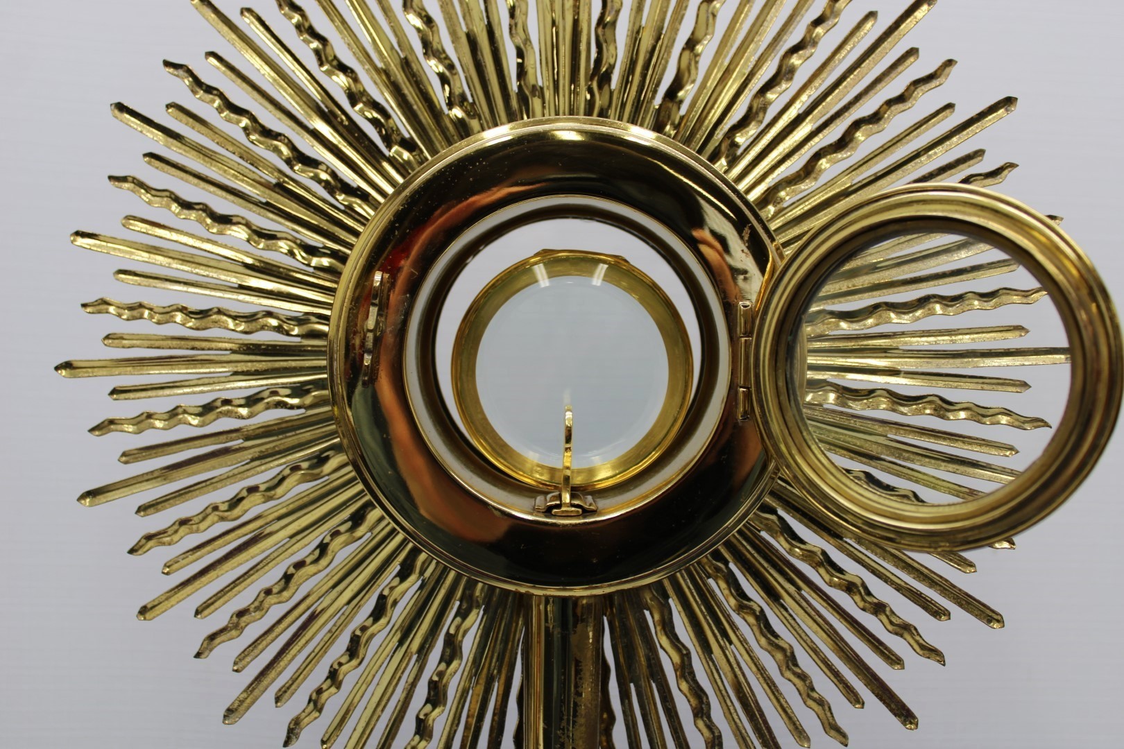 This is a previously used monstrance, measuring 21 1/2" tall. This monstrance features a sunburst rays and a finial cross. The luna, which is sterling silver and glass, is included in the sale of the monstrance.