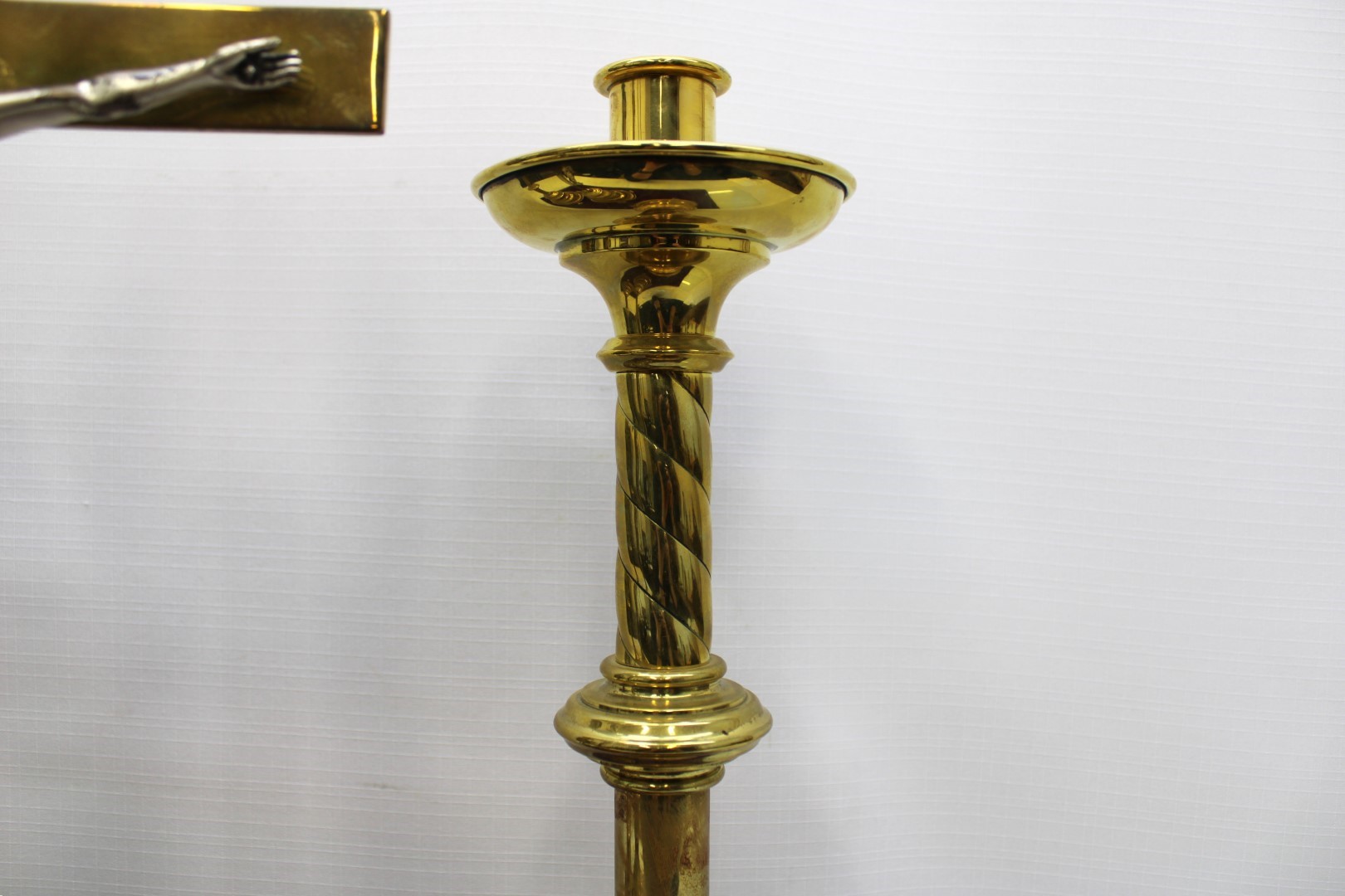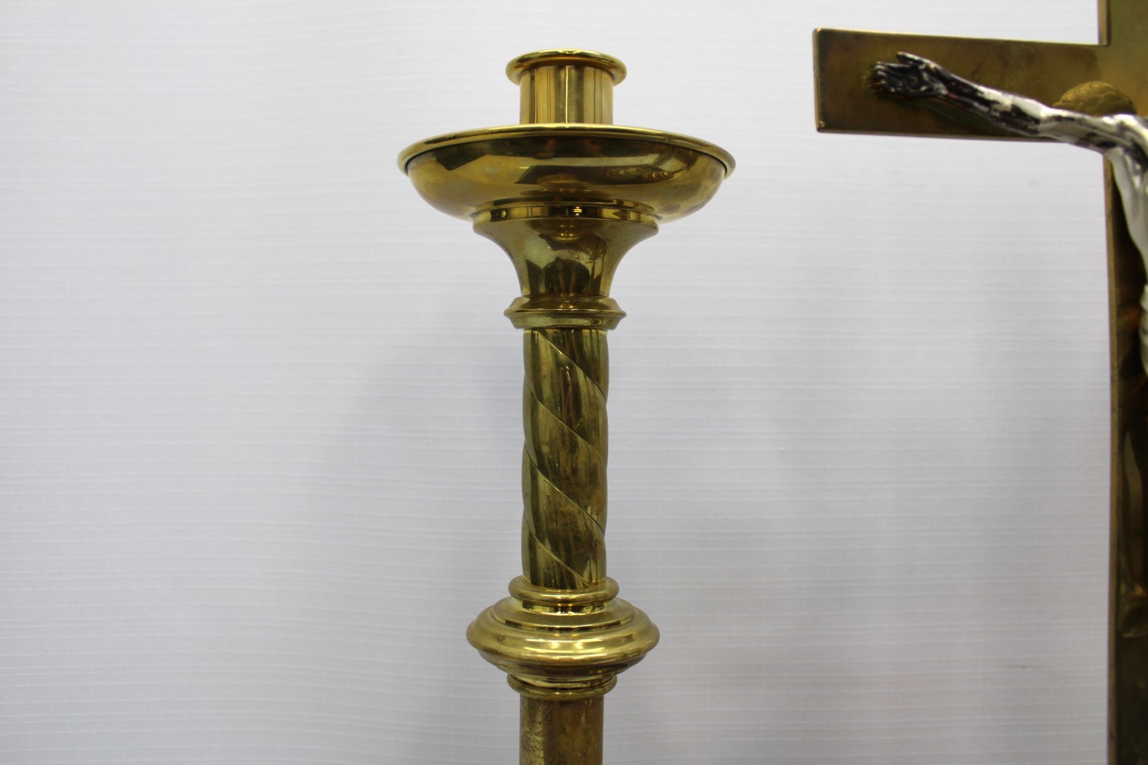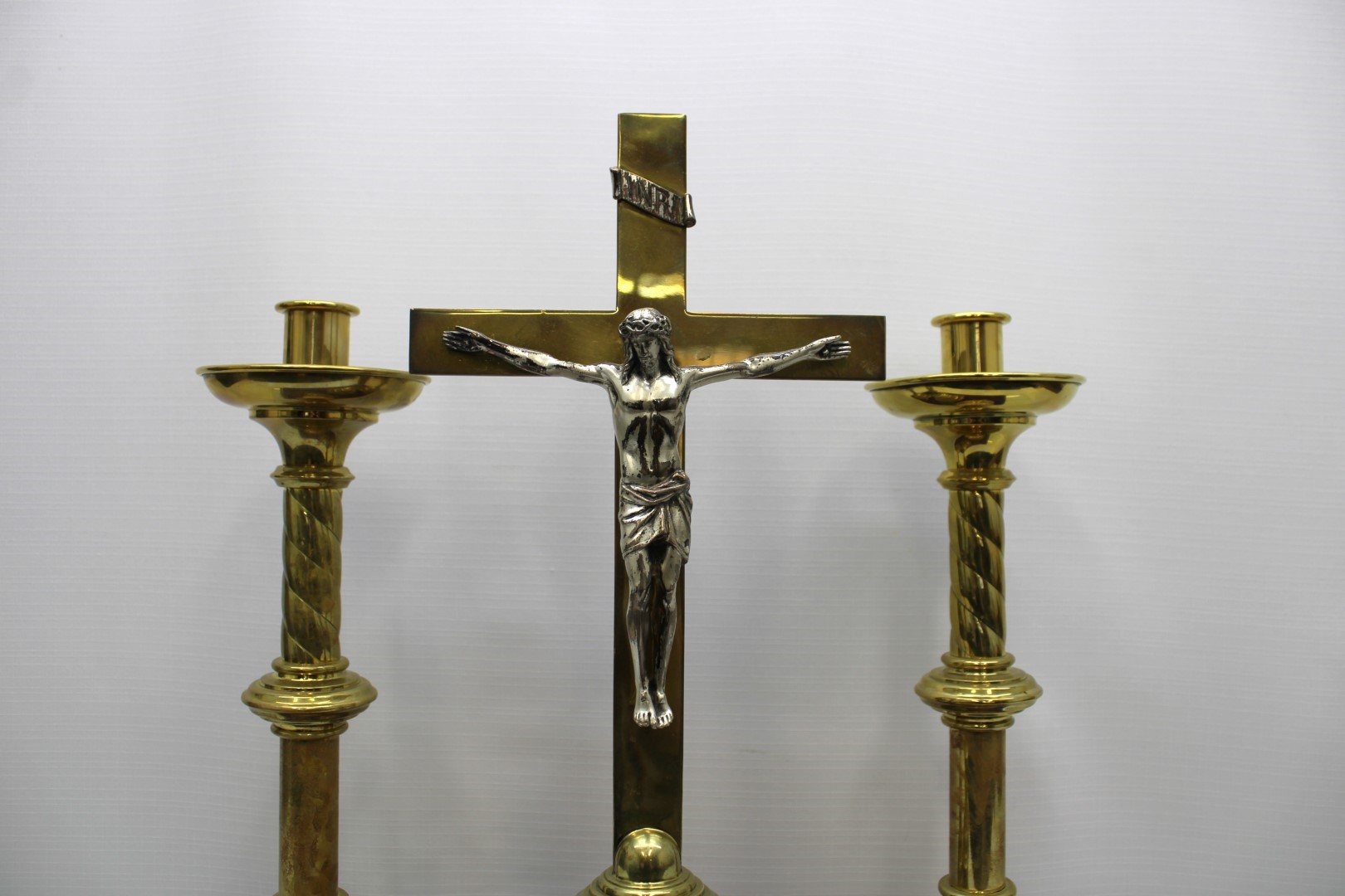 This is a previously owned set of Gorham brass altar crucifix and altar candlestick pair. The crucifix measures 21" tall and the candlesticks measure 16 1/2" tall with a 1 1/8" socket. All three pieces are in great condition.