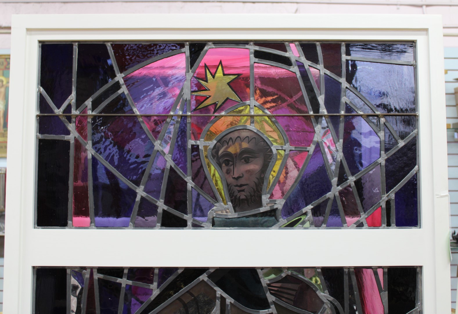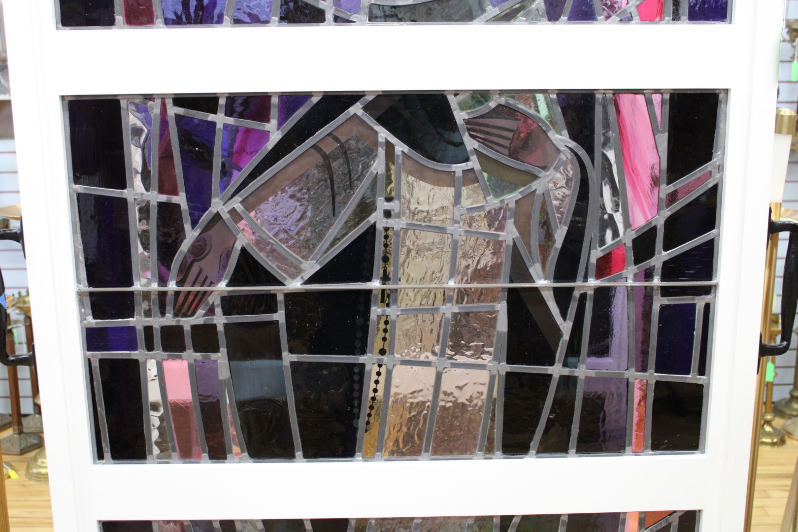 This is a standing stained glass images of St. Dominic, in three panels. This piece stands 73" tall and the base is 42 1/2" wide by 24" deep. This piece is in excellent condition and features handles for ease of movement.