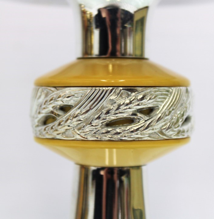 This is a previously owned 10-1/4" Sterling Ciborium with a Latin Engraved Calyx, adorned with a Metal Wheat Motif inlay along a Faux Ivory Node.
