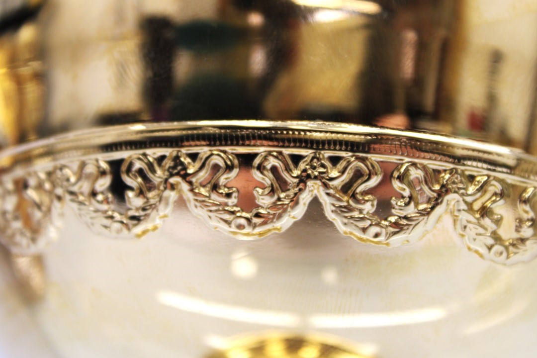 This is a previously owned 12" Gold Plated Ciborium with a stunning Laurel embossing along the calyx. The base and lid contain a matching leafy motif. The base also holds a memorial engraving.