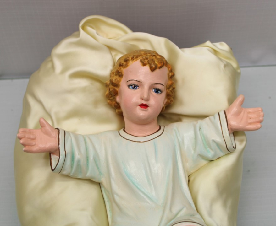 This is a previously owned 11.5" Plaster Infant with a satin Padded Manger