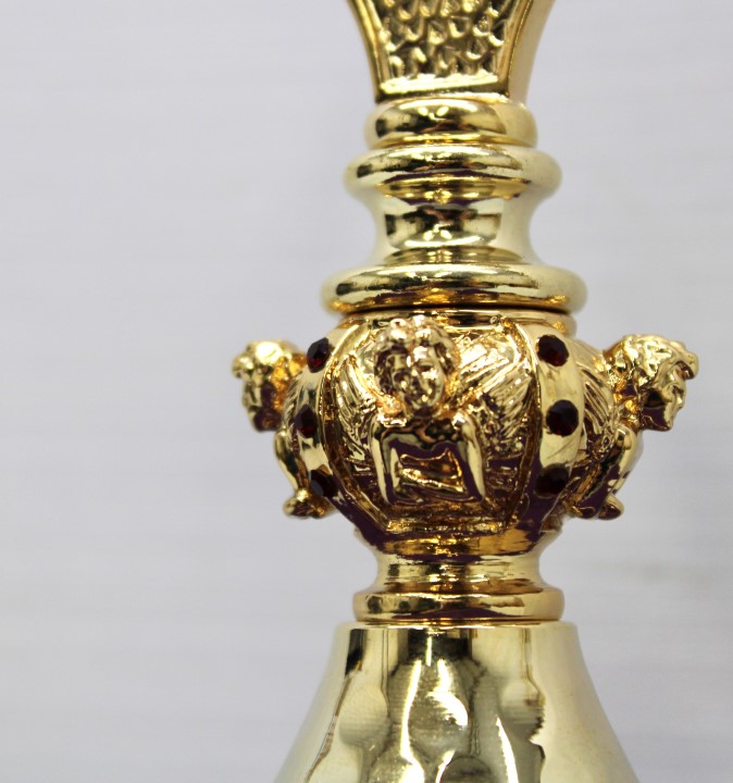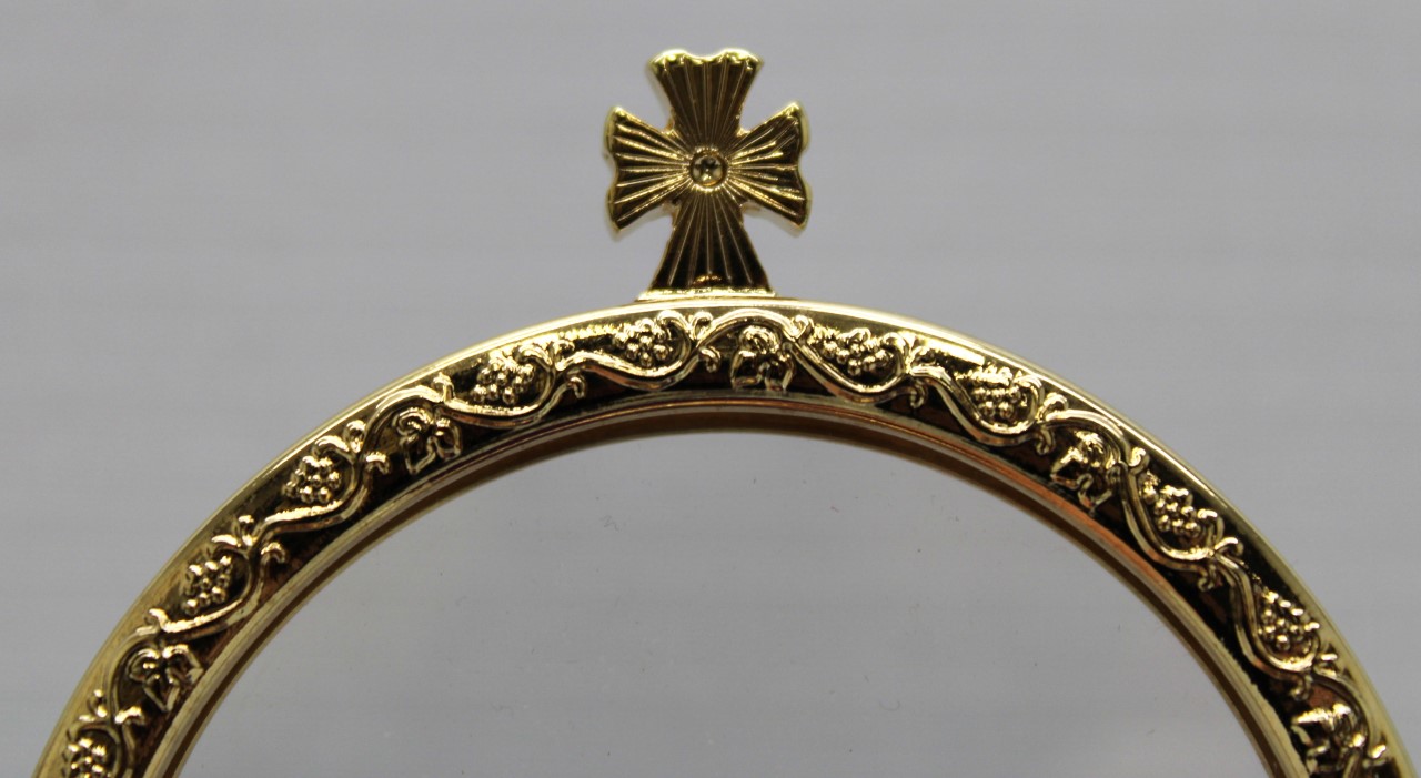 Handcrafted Italian 7.5" tall Chapel Monstrance with 24K gilding. Wheat and grape motif running along the outer rim of the glass. A node showcasing 4 cherubs and 12 red stones and a hammer finish on the base. Cross finial contains engraved rays from the center-point. Holds a 2-3/4" Priest Host.