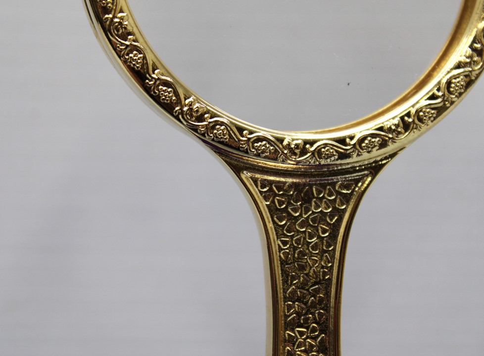 Handcrafted Italian 9" Chapel Monstrance gilded in 24K gold.Wheat and grape motif running along the outer rim of the glass.The stem showcases a beautiful tear-drop style hammered finish, and the base - a stunning tri-foot lifted base. Cross finial contains engraved rays from the center-point. Holds a 2-3/4" Priest Host.