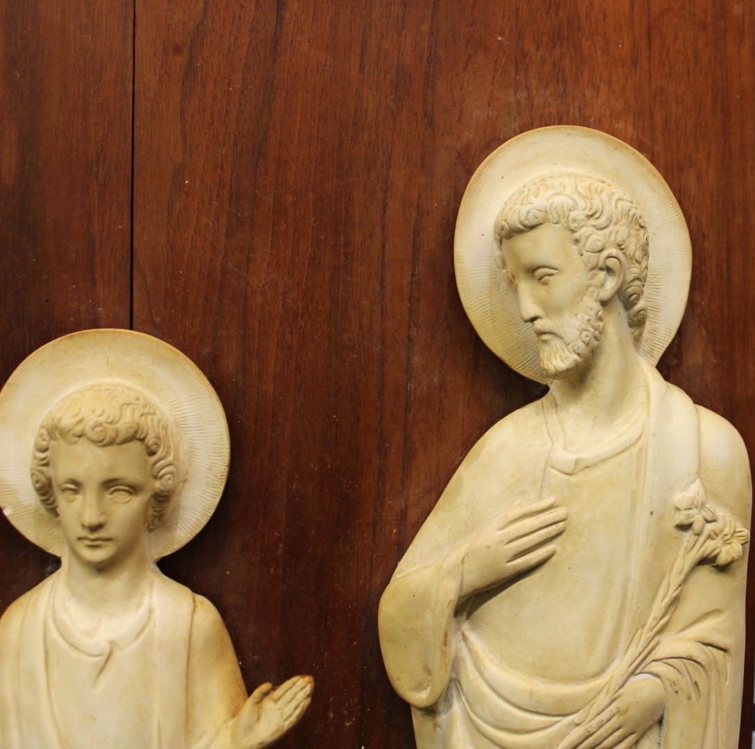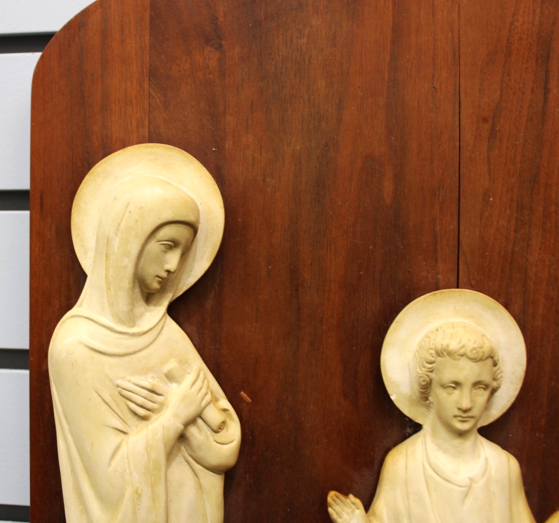 This is a previously owned plaster relief of the Holy Family on a wood backing. This relief measures 14" wide by 19" tall and is in great condition.