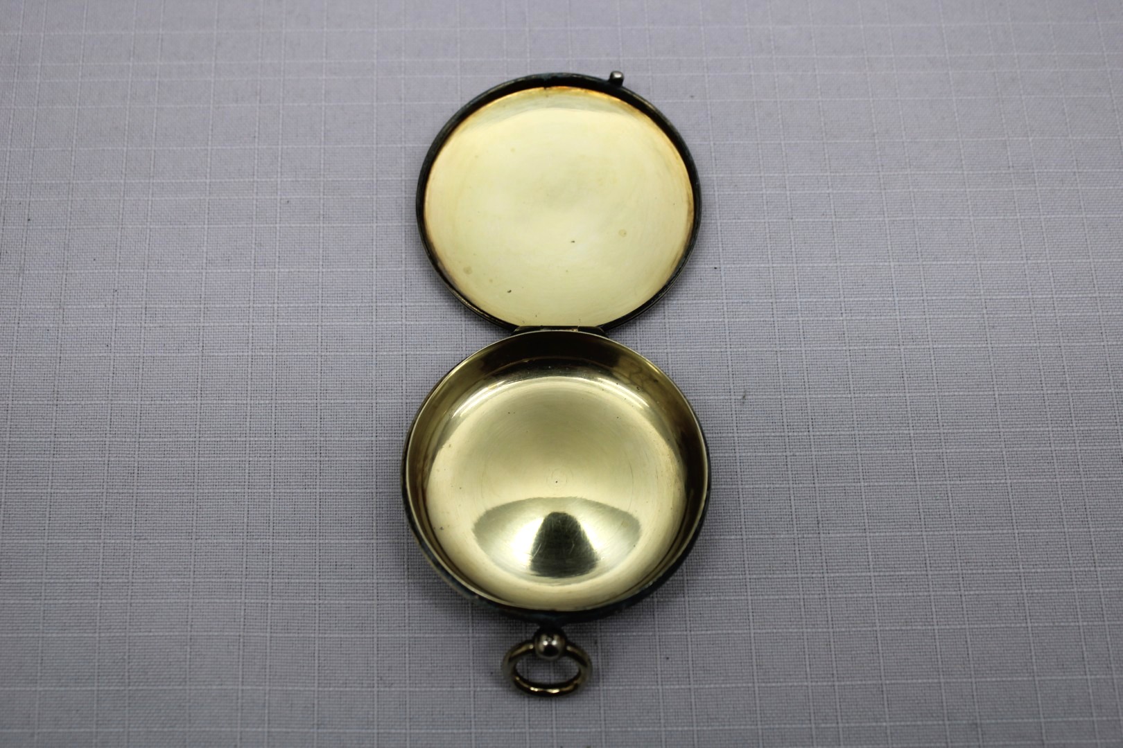 This is a previously used 1-3/4"  sterling silver pocket watch style pyx with hand engraving on the front. The interior is gold plated and overall in good condition.