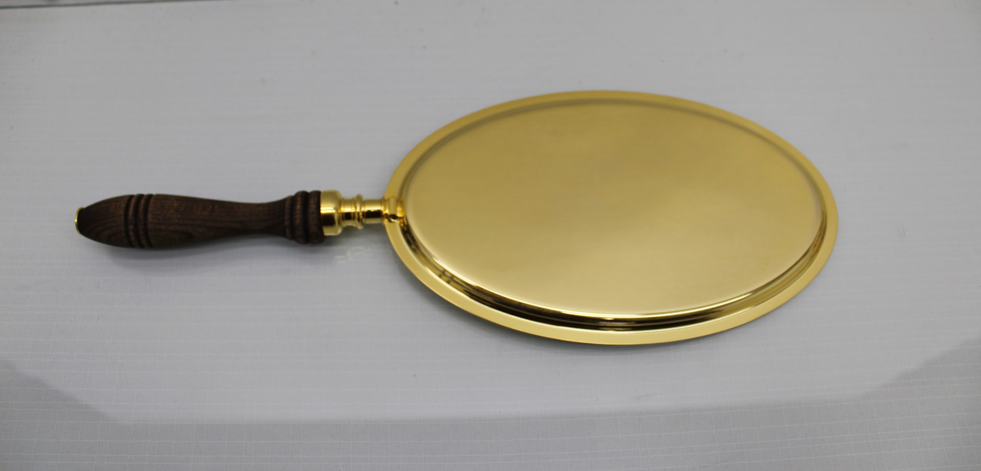 This is a previously owned gold plated paten with handle. This measures 15" in total length with the plate measuring 9". This piece is in excellent condition.