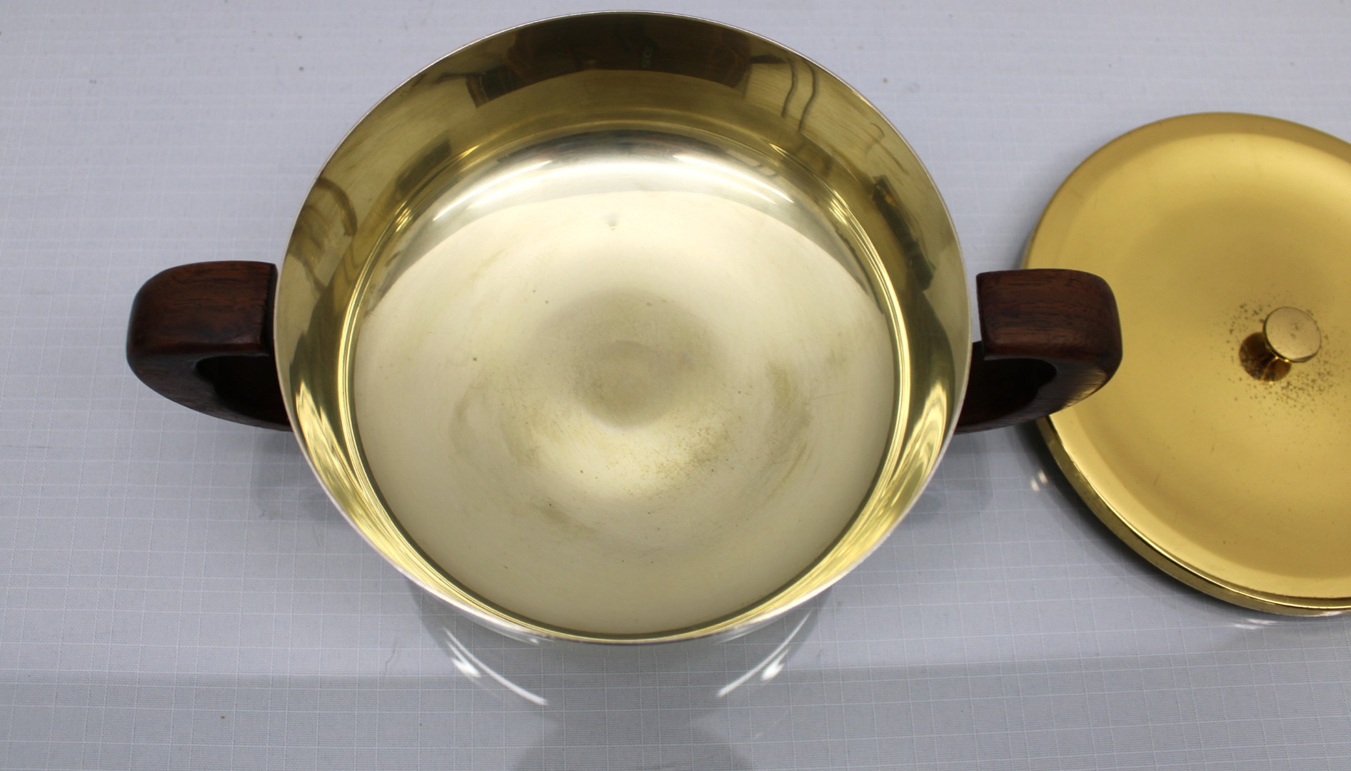This is a previously owned sterling silver bowl ciborium with wooden handles. This piece measures 3" tall and has a bowl diameter of 5 5/8" and is in good condition.