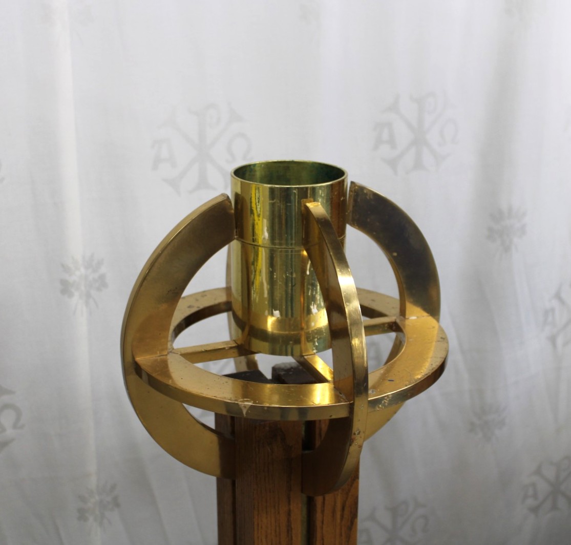 This is a previously used paschal candlestick. It is 46 1/2" tall with a 4" socket. This piece does come with a matching follower (not pictured)