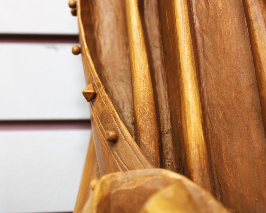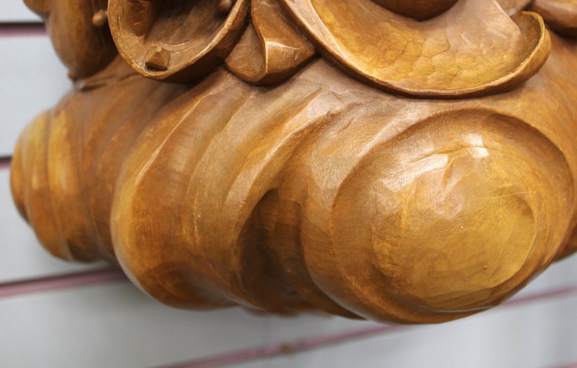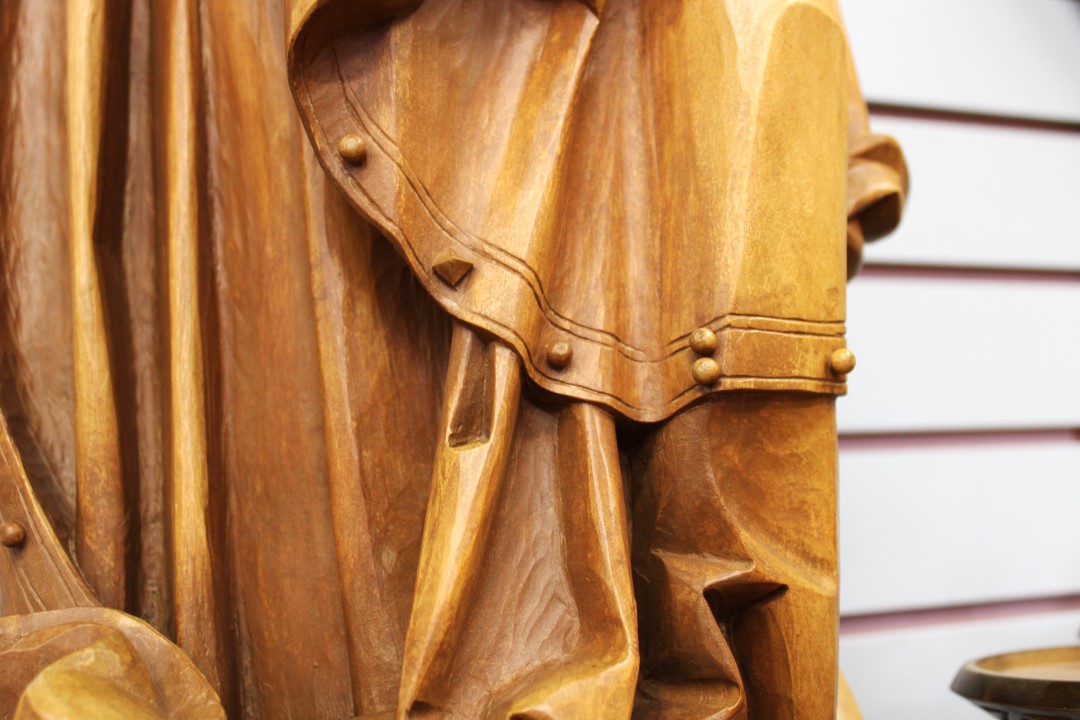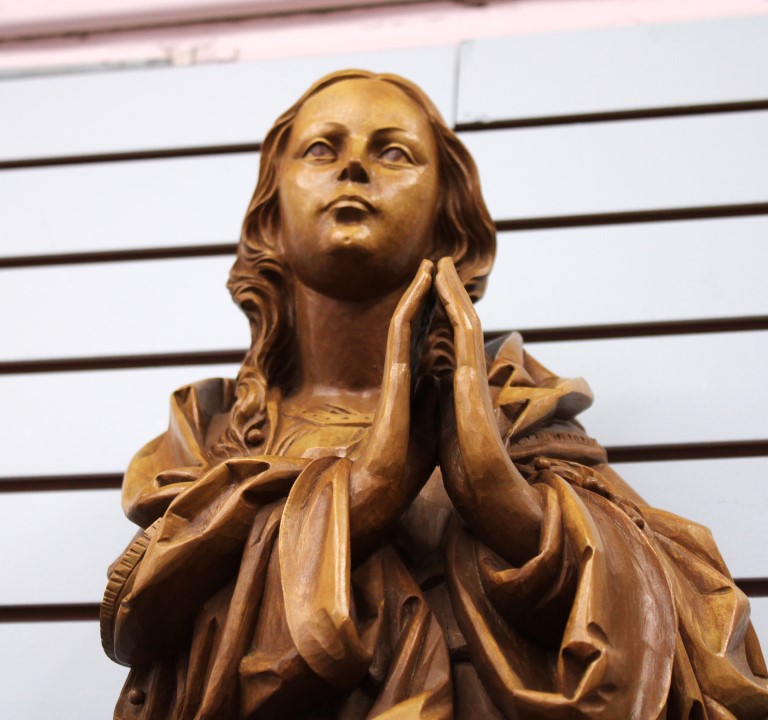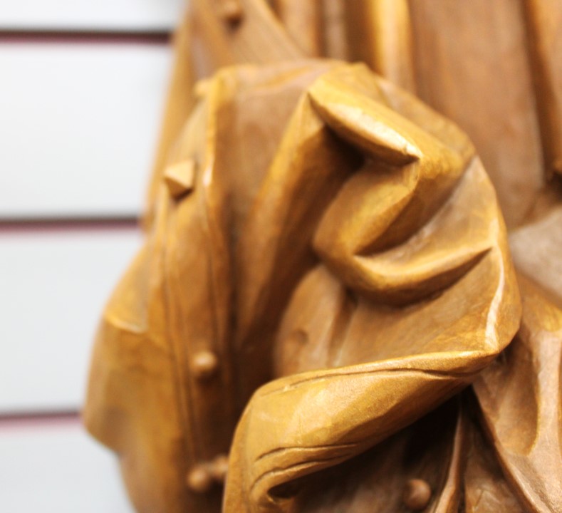 This is a previously owned 39" Stained Linden Wood Carved Assumption of the Virgin Mary, made in Oberammergau, Germany