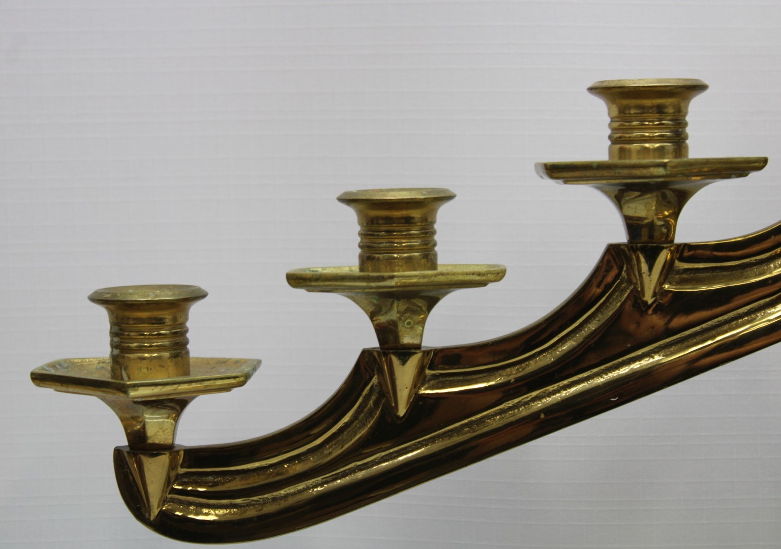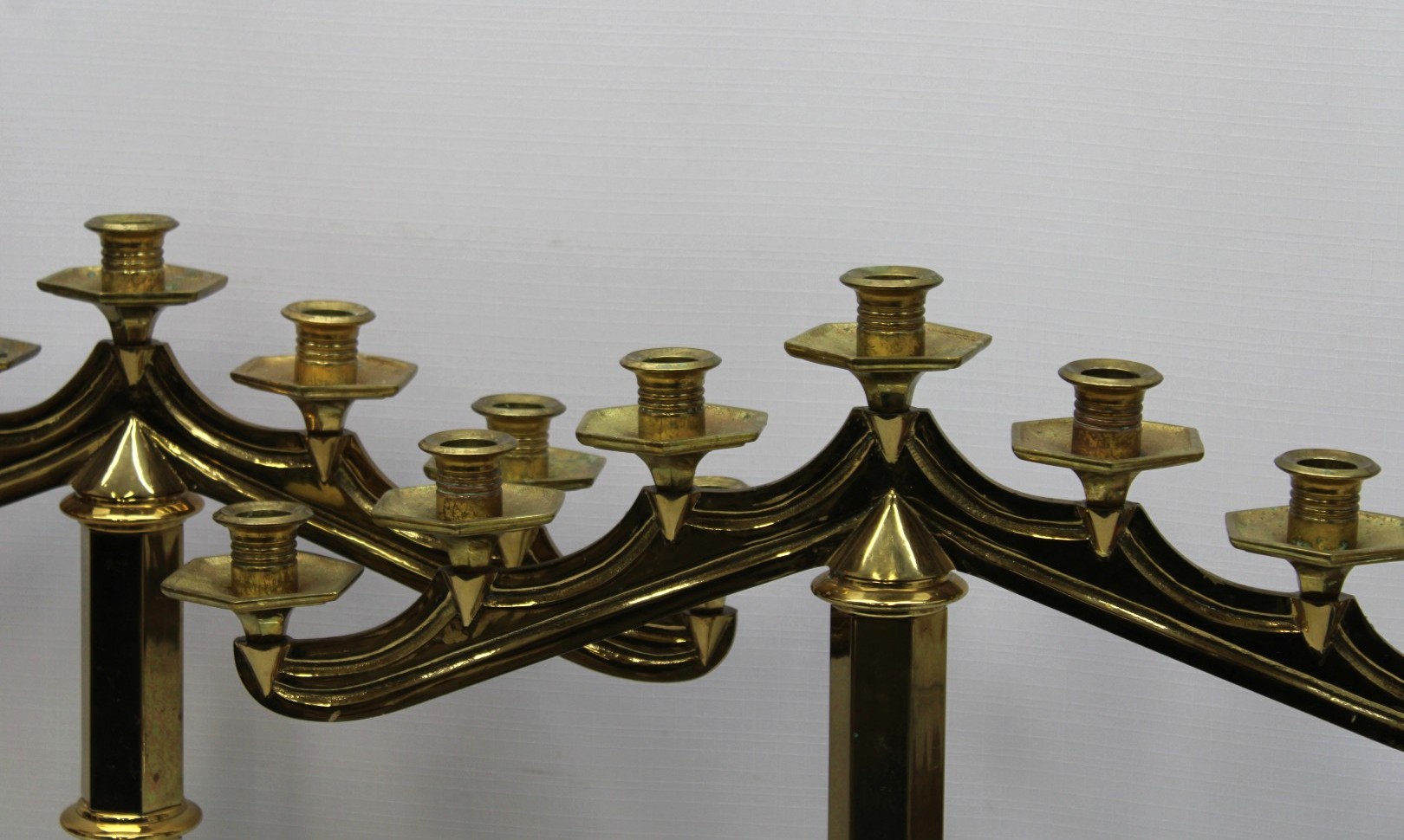 This is a pair of used 17" tall 7 Lite Candelabras with hex base and round node. This pair contains some basic wear and tare that comes along with age and use, but are in good condition.