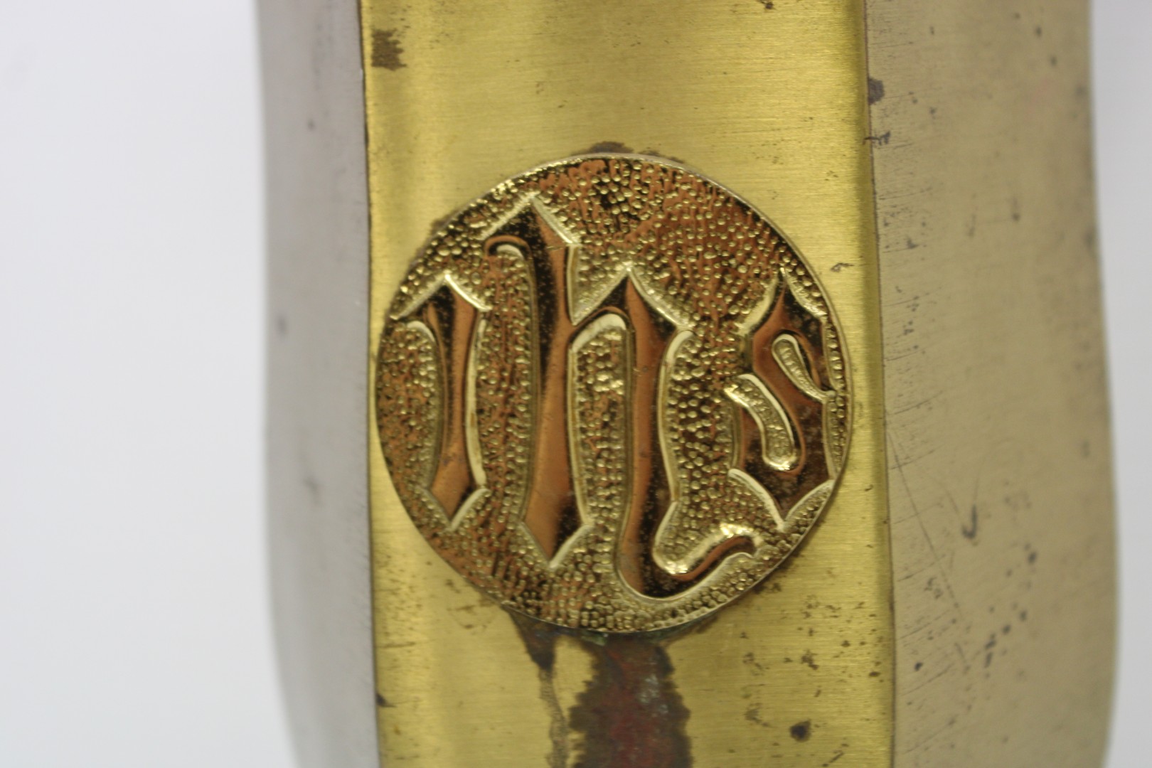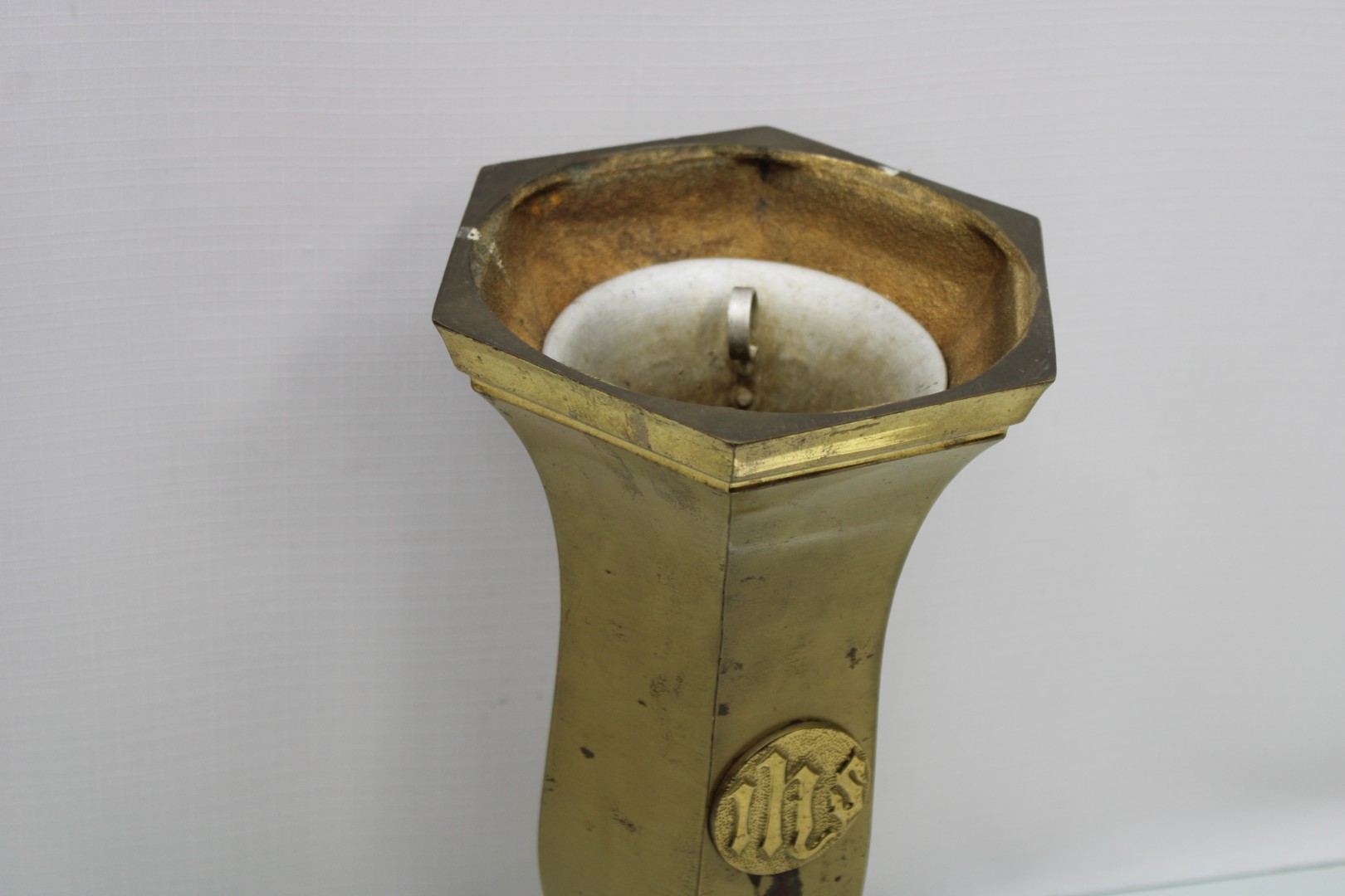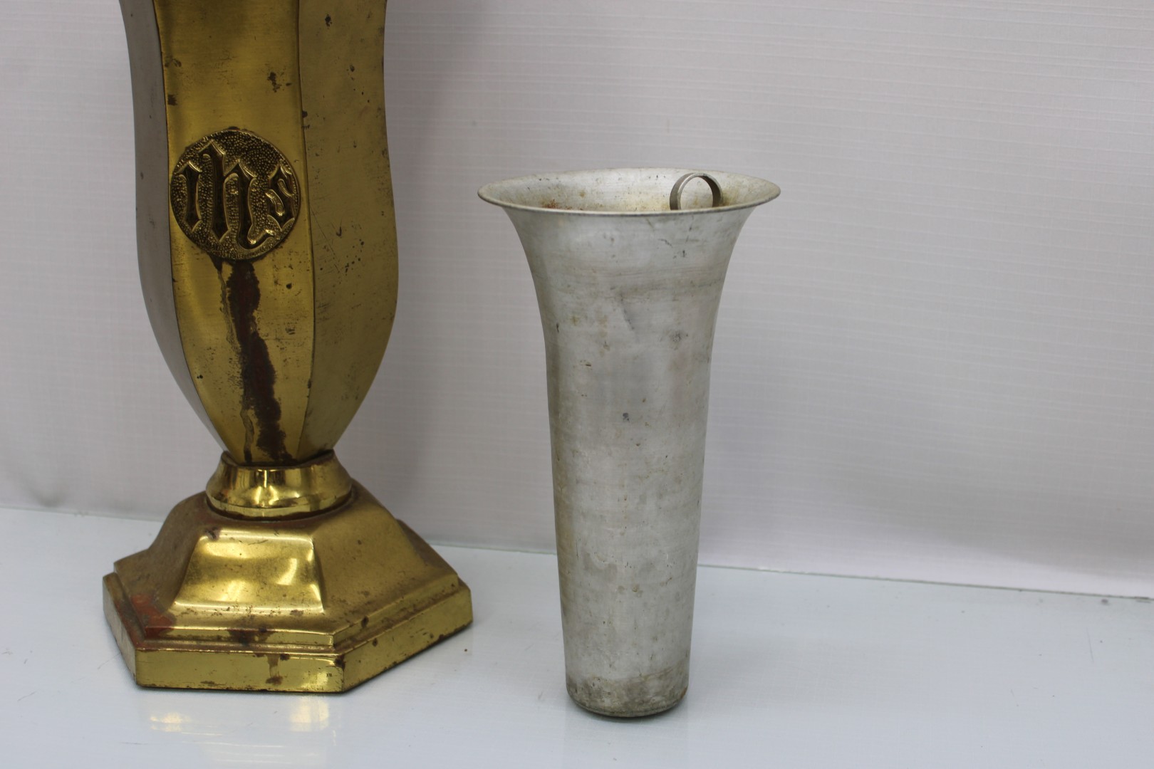 This is a previously used 14" cast brass vase with liner. This piece does show signs of wear, but is in good condition.