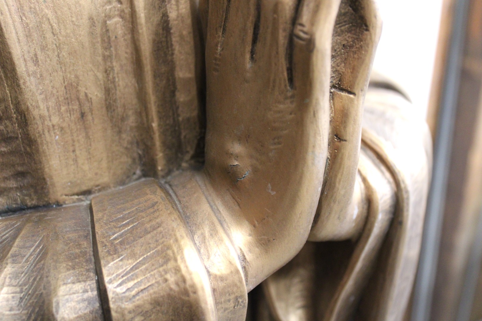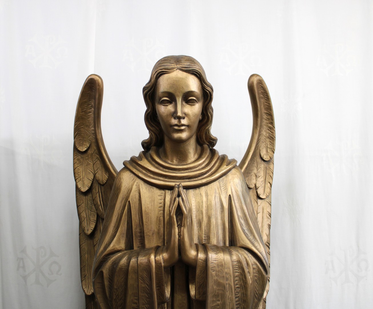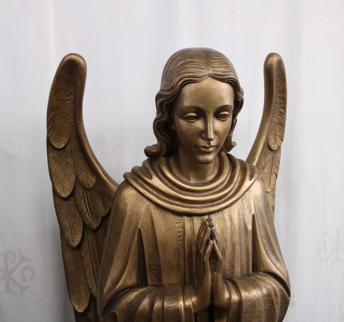 This is a previously owned fiberglass full round angel statue in bronze tone. This is manufactured by Demetz in Italy, and has one imperfection on the right hand (pictured). This is an indoor/outdoor statue and will fare well in either environment.