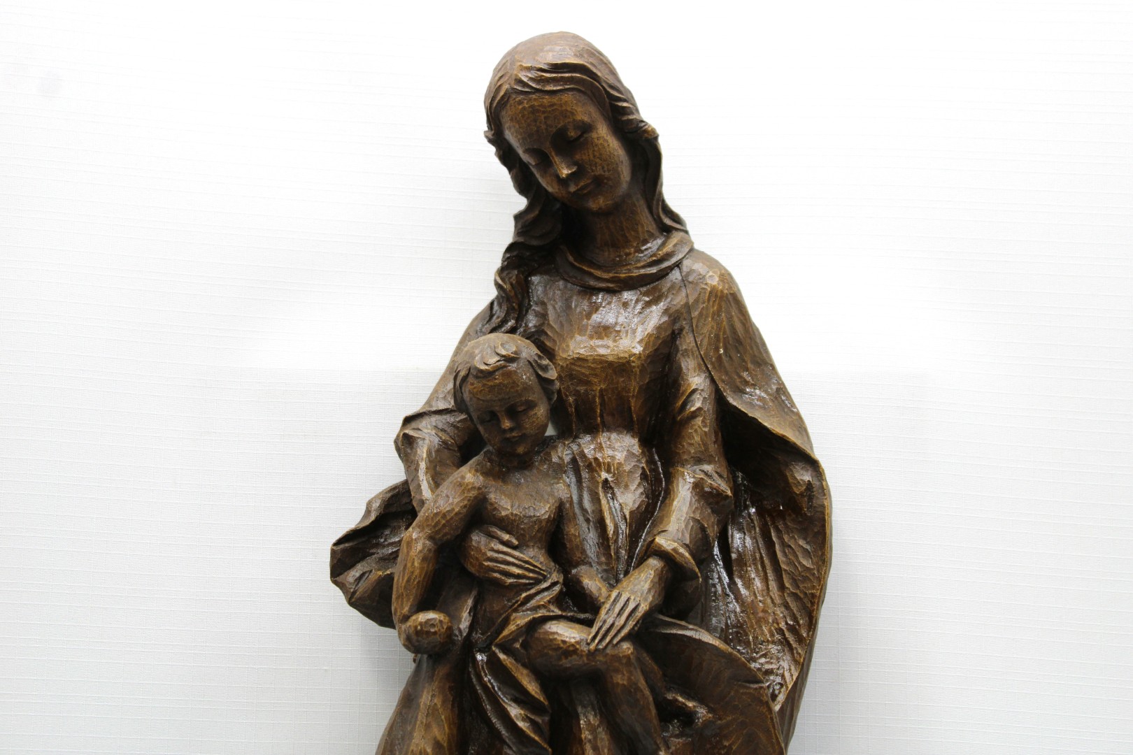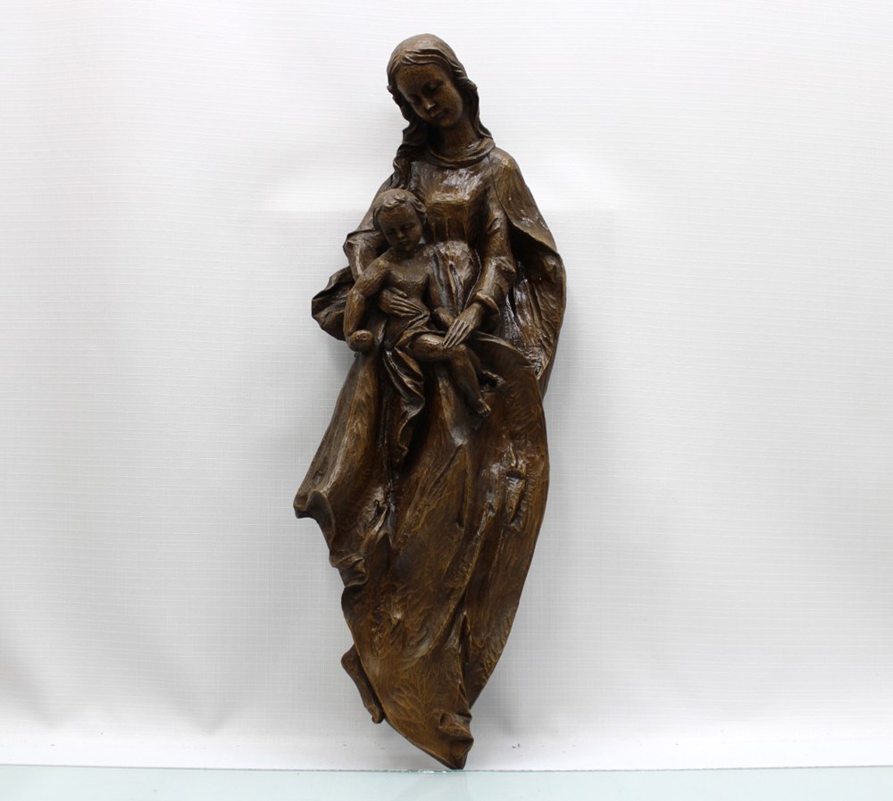 This is a previously owned wood carved relief of Madonna and Child. This piece is in good condition.