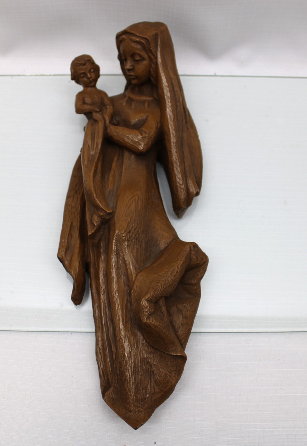 This is a previously owned wood carved relief of Madonna and Child that is 16" tall. This piece is in good condition, with one small repaid made in house.
