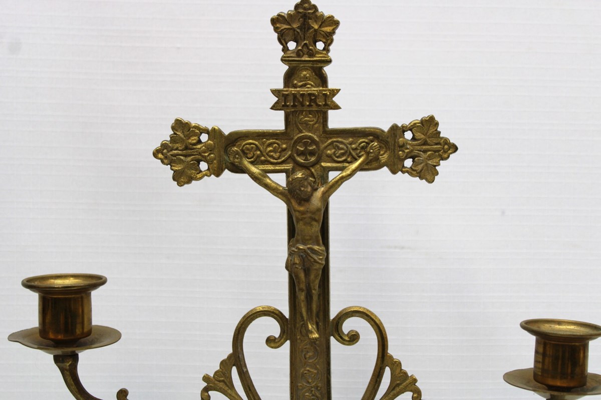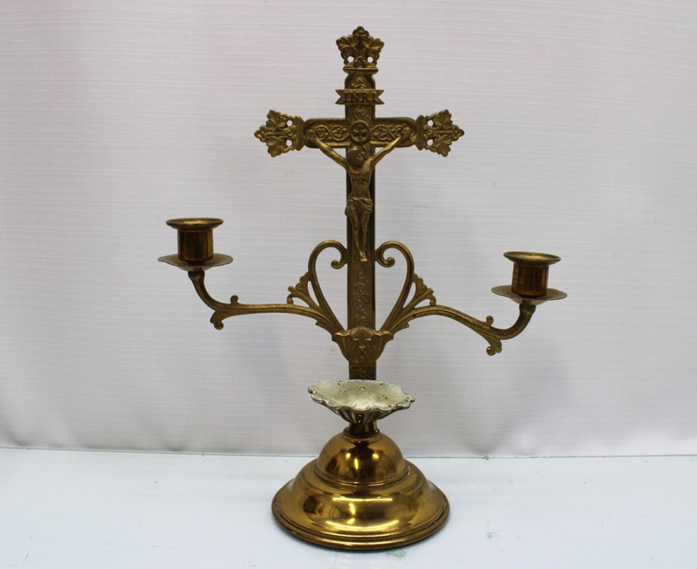 This is a previously owned 13" brass sick call crucifix. This piece has 2 candle holders and shell for holy water.