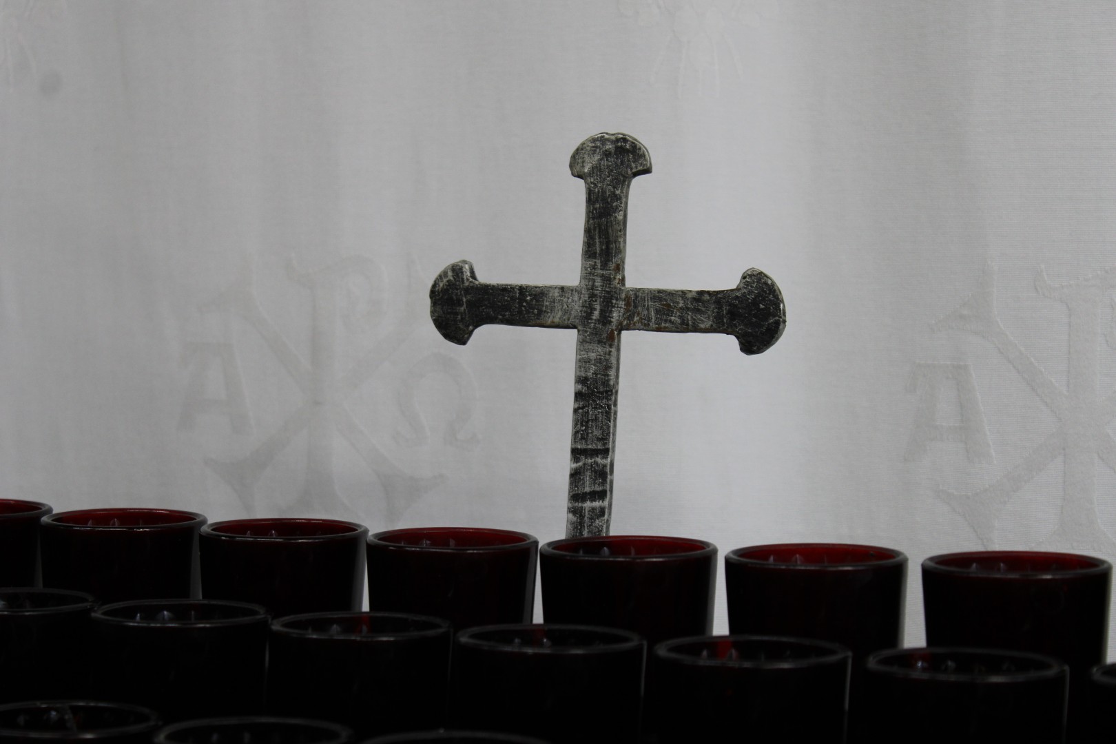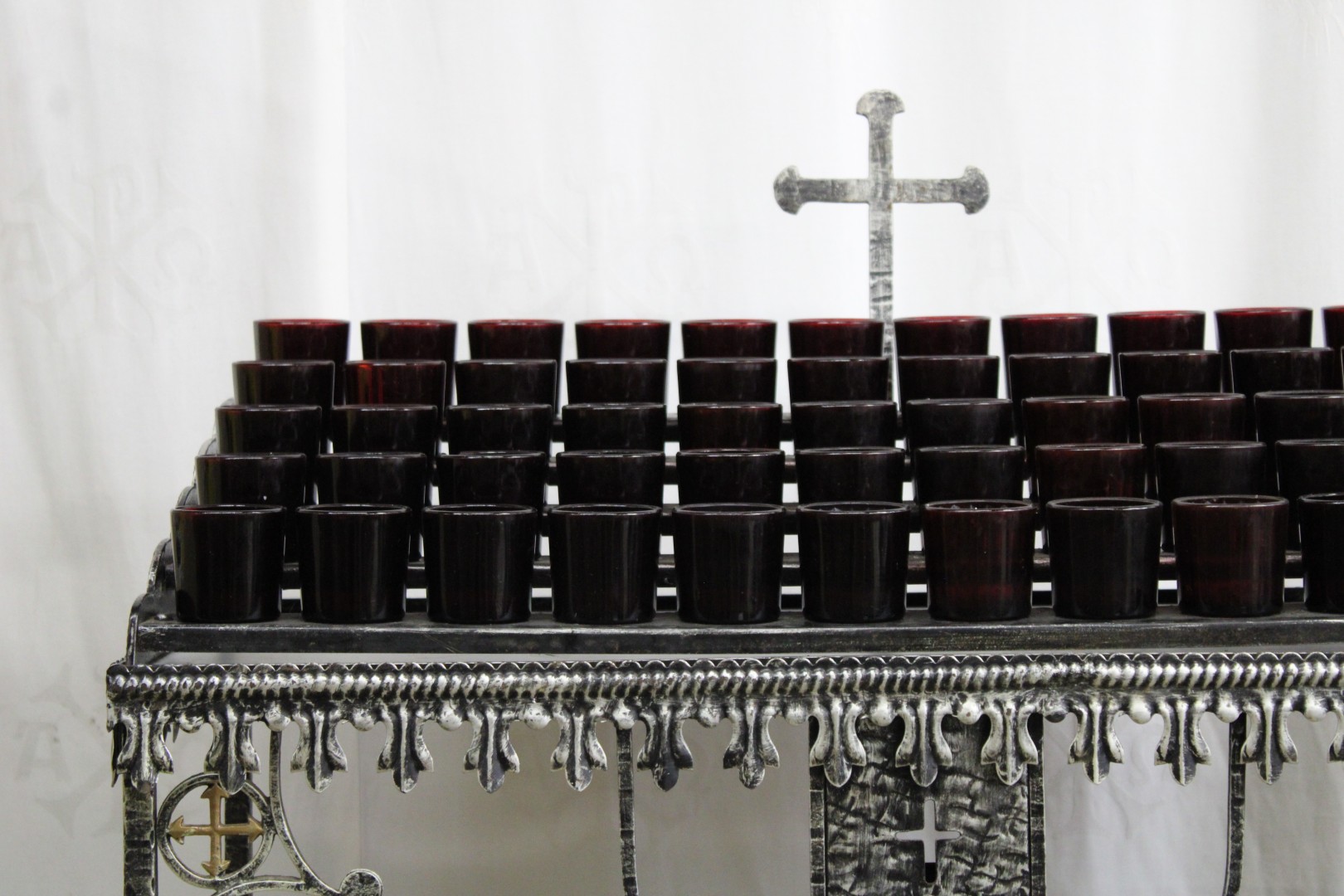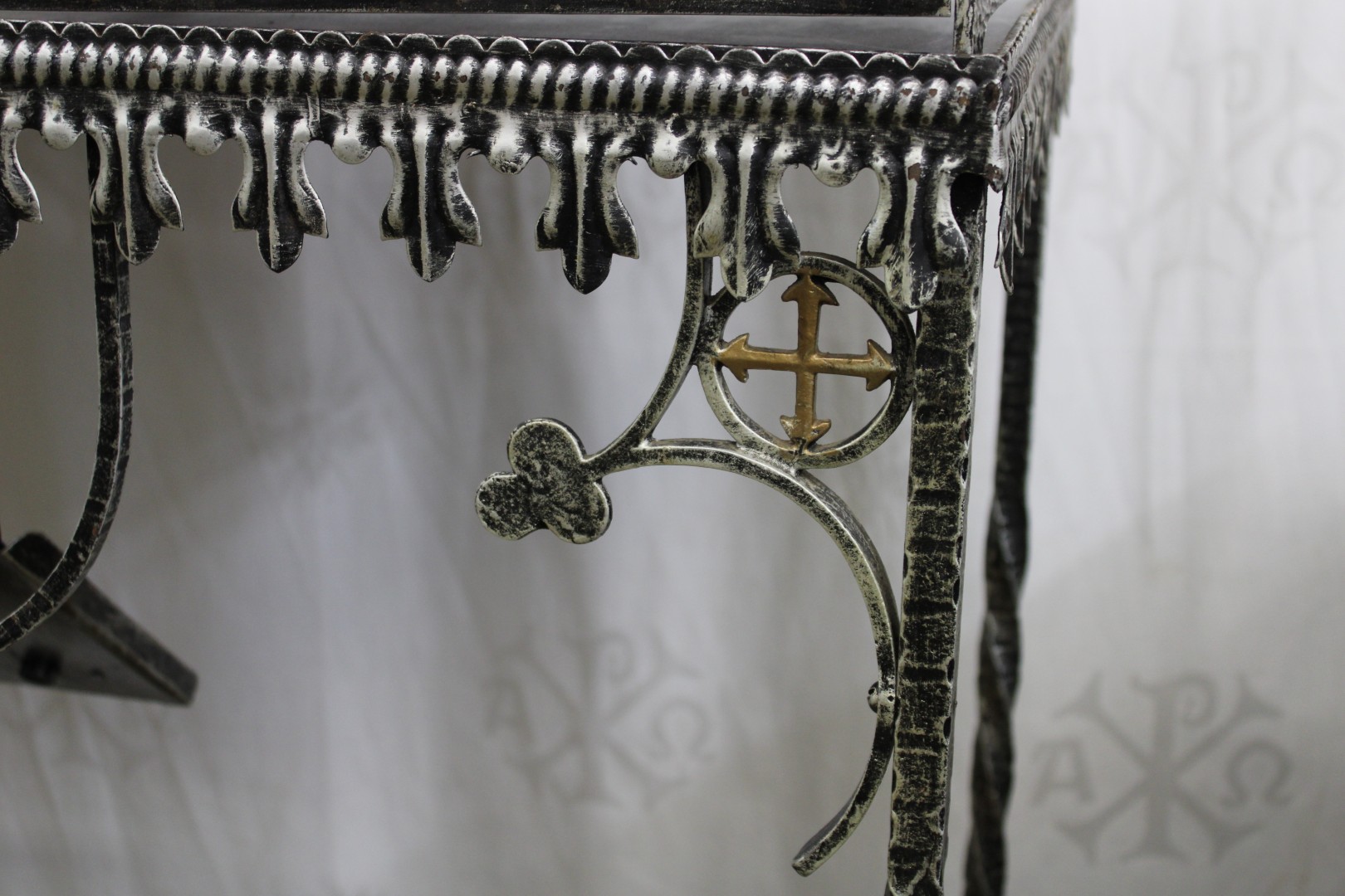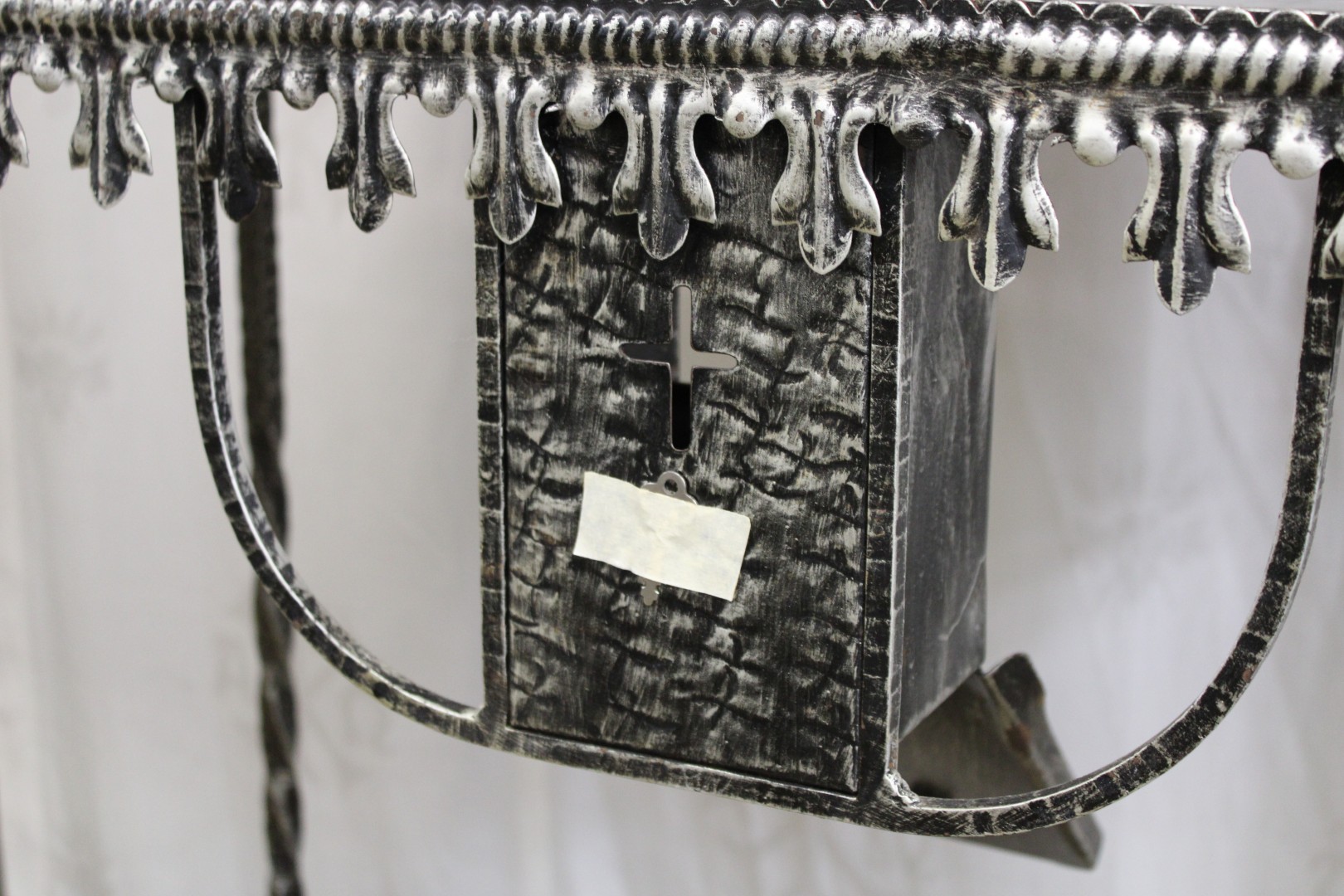 This is a previously owned 60 lite votive rack. This piece is made of wrought iron in gothic style and is on wheels for easy maneuverability. The dimensions are 33" wide, 14 3/4" deep, and 48" tall.