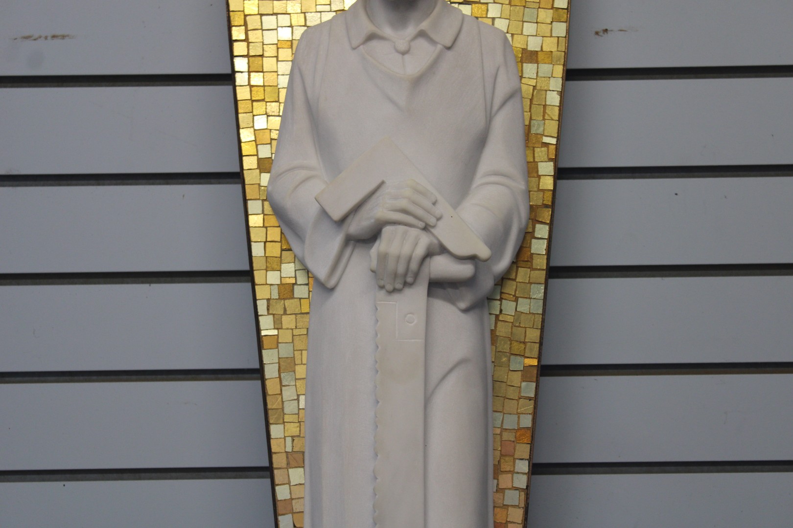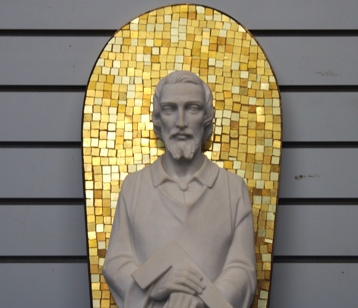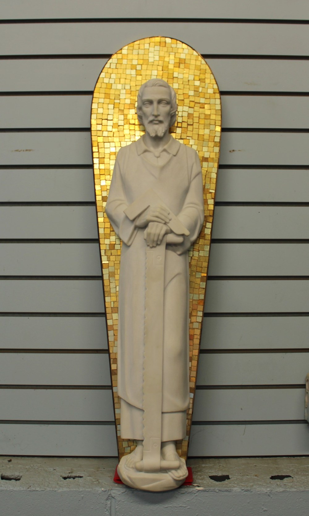 This is a previously owned marble relief of St. Joseph on a gold mosaic backing, standing 35" in height. This piece is in great condition.