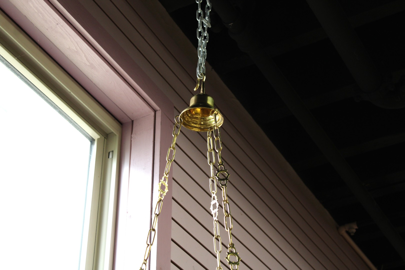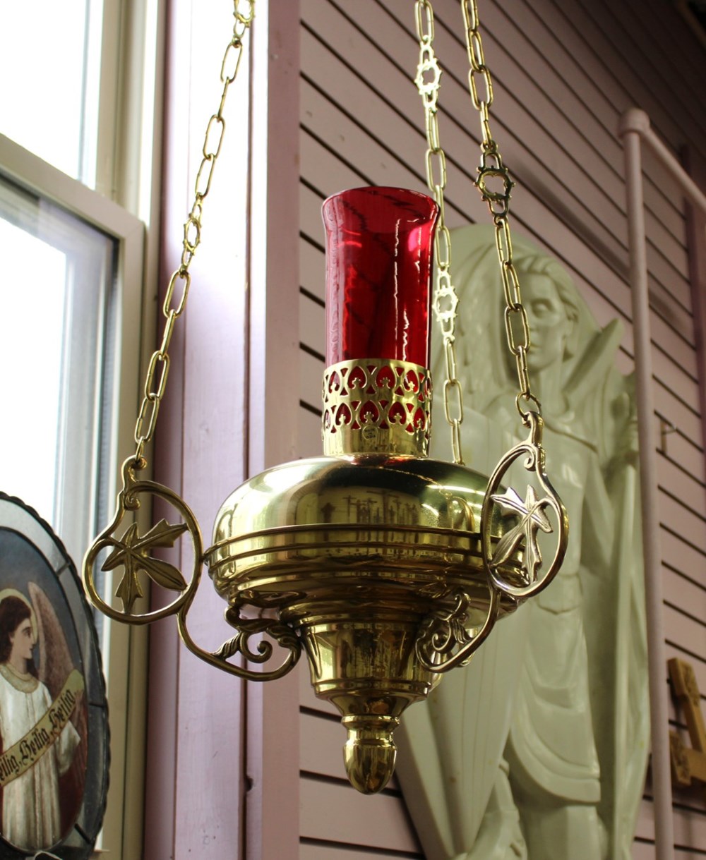 This is a previously used hanging brass sanctuary lamp. This lamp is in overall good condition, and comes with the ruby glass. The chains are easily adjustable so the lamp can hang level.