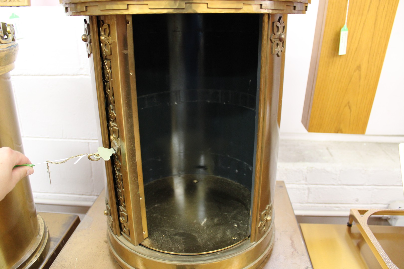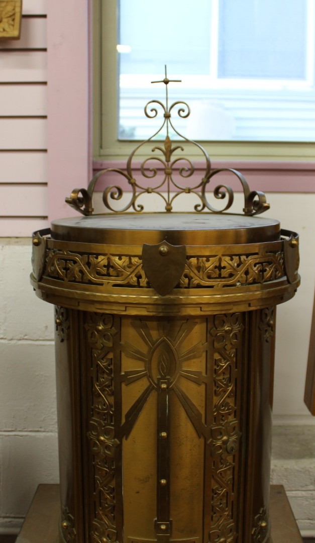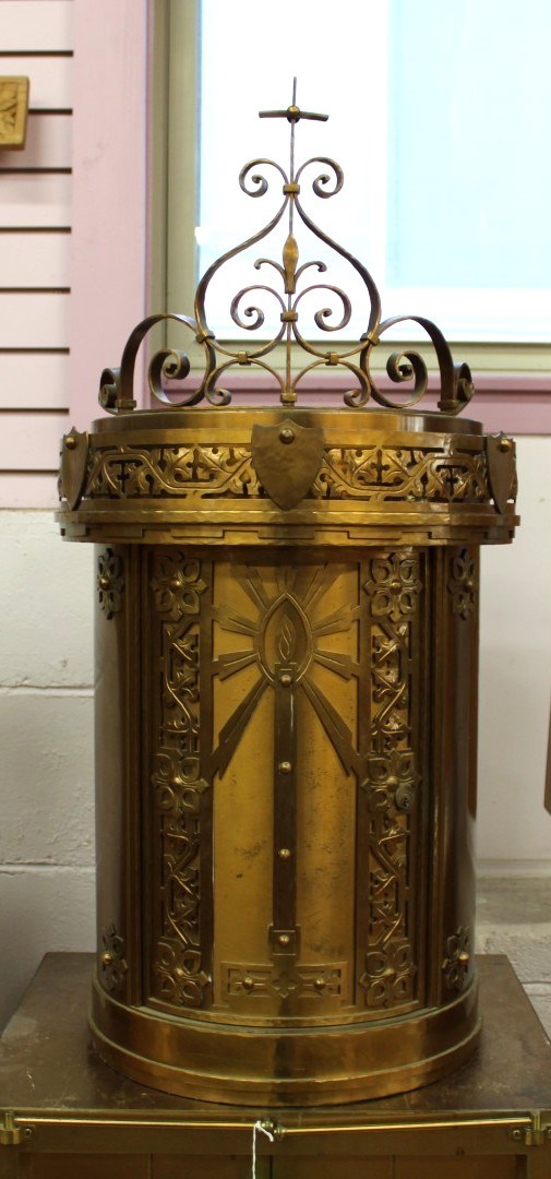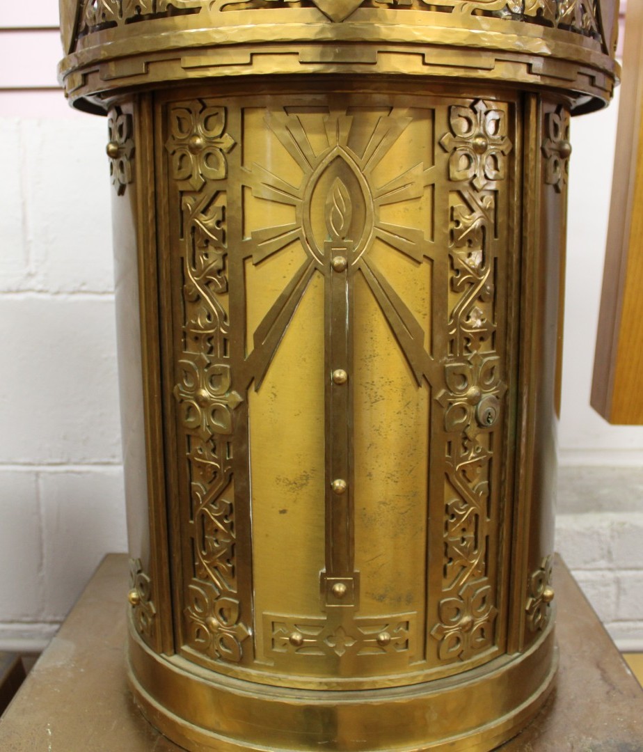 This is a previously owned bronze tabernacle. This piece measures 33" tall to the top of the adoration shelf. The top itself does rotate for adoration. This tabernacle is un-lined and comes as is.