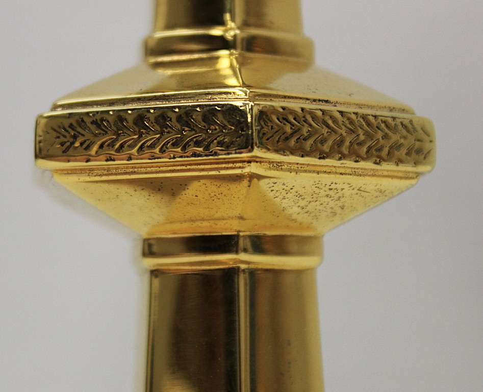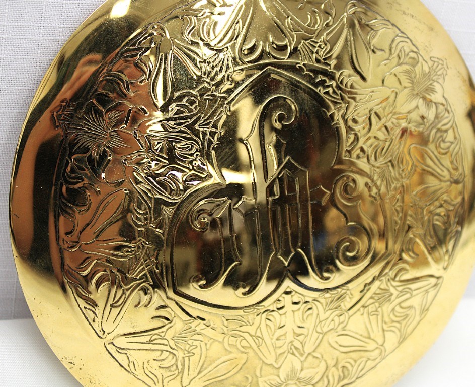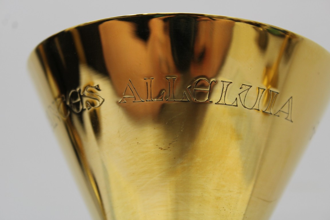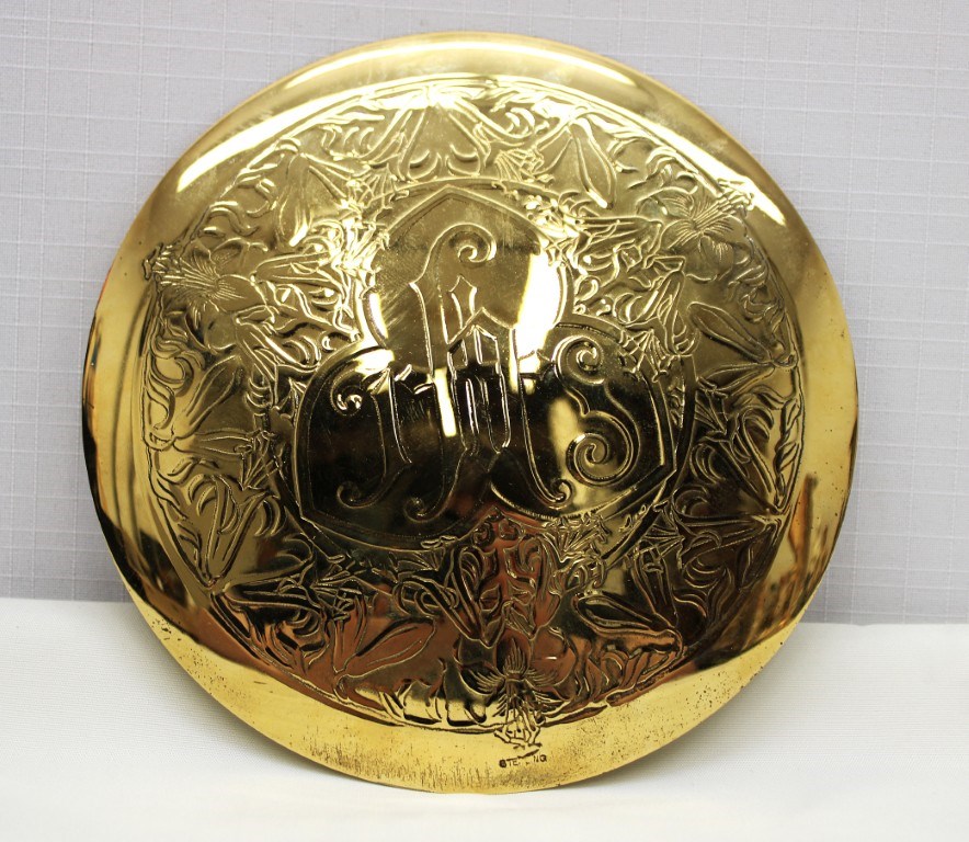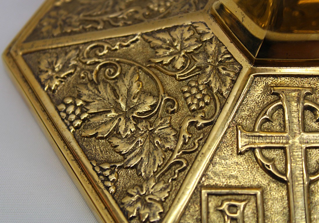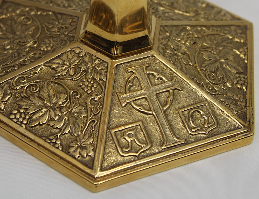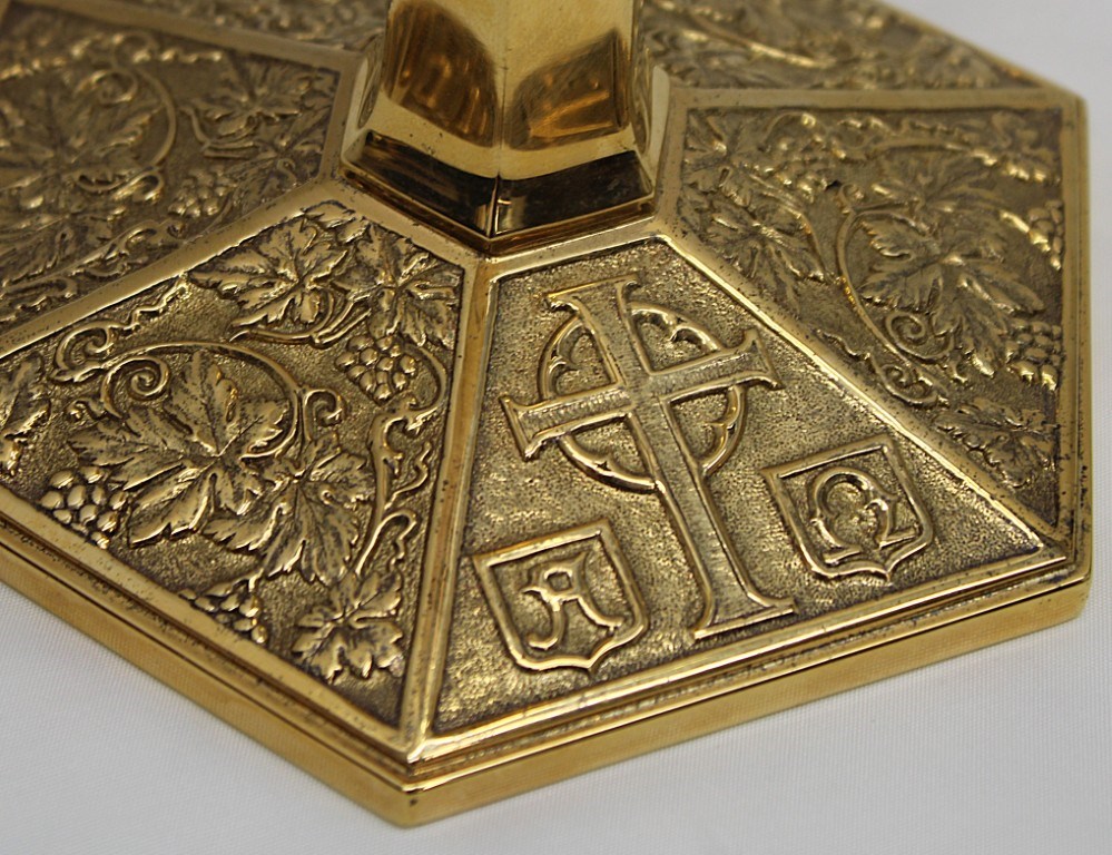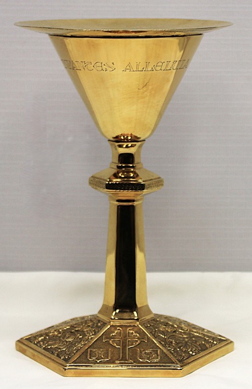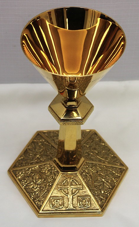 This is a stunning 8-1/4" tall 925/1000 Sterling Hex Base Chalice with Hex Node.The "V" Cup presents Latin Engraving, and the base is adorned with elaborate wheat and grape patterns. The base also depicts a cross with the symbols of the Alpha and Omega. The chalice comes alongside a matching 5-1/2" Diameter Scale Paten with an elaborate IHS stamping and a case.