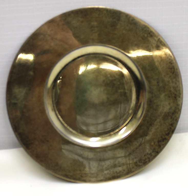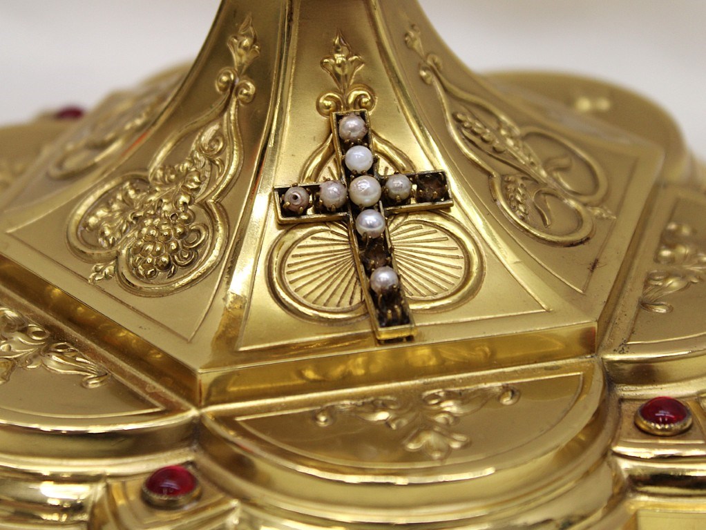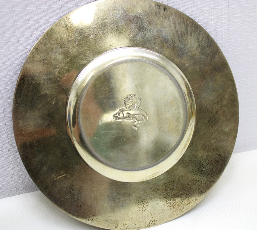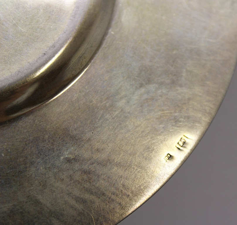 This is a 10-7/8" tall sterling cup chalice with a pointed and scalloped base. The base holds 6 stones on the points, and the base cross is set with several faux pearls. The chalice comes with a 6-1/16" diameter 800 sterling well paten