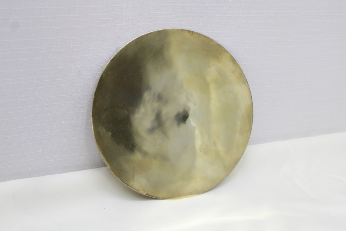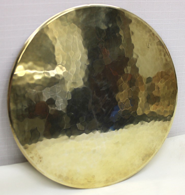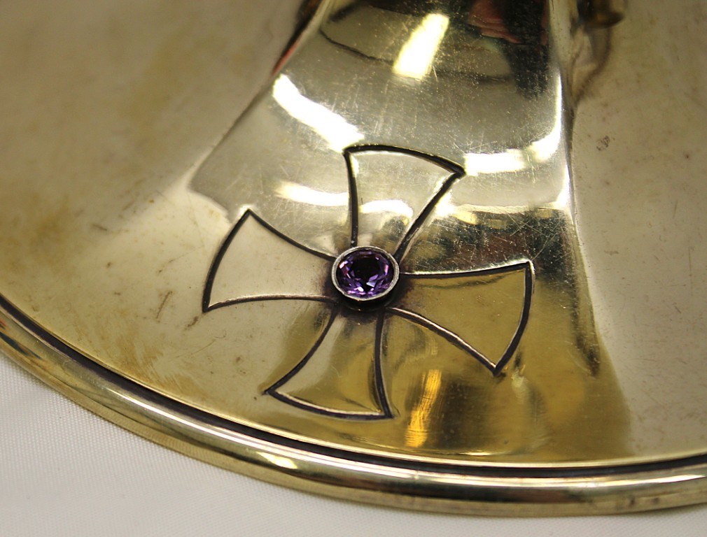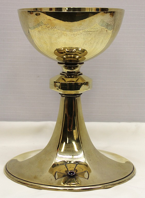 This is a 7-1/4" tall Sterling Chalice with a large round base, harboring a beautifully amethyst colored stone and malthesse base cross. There is a disc-shaped node along the stem and it comes with a 5-3/4" diameter scale paten with a hammered finish on the back.