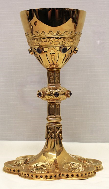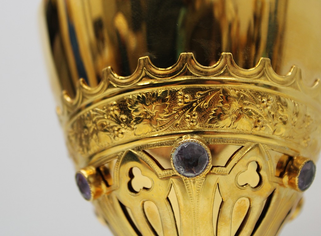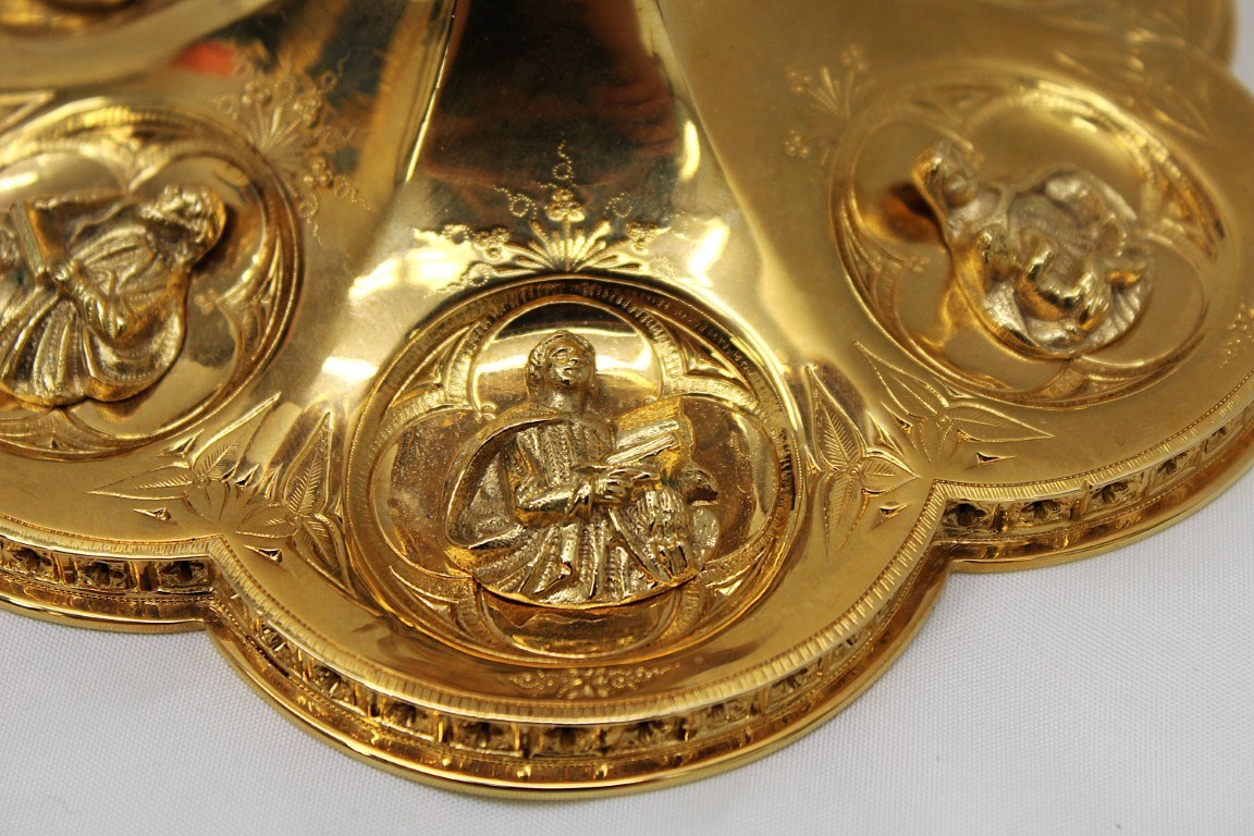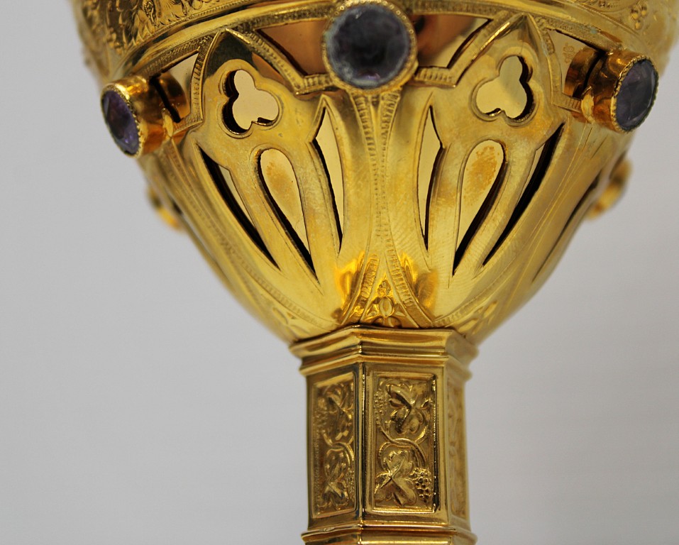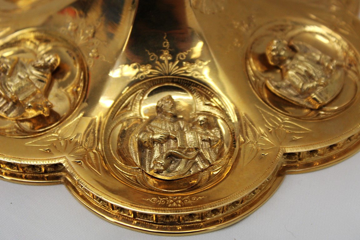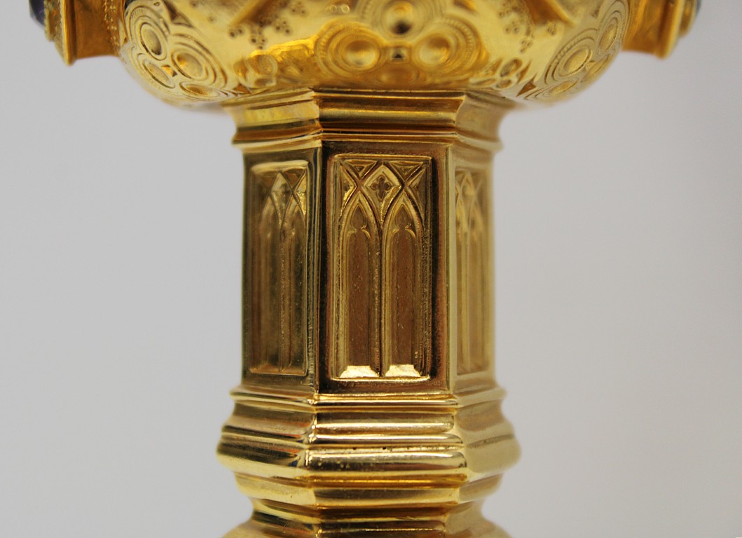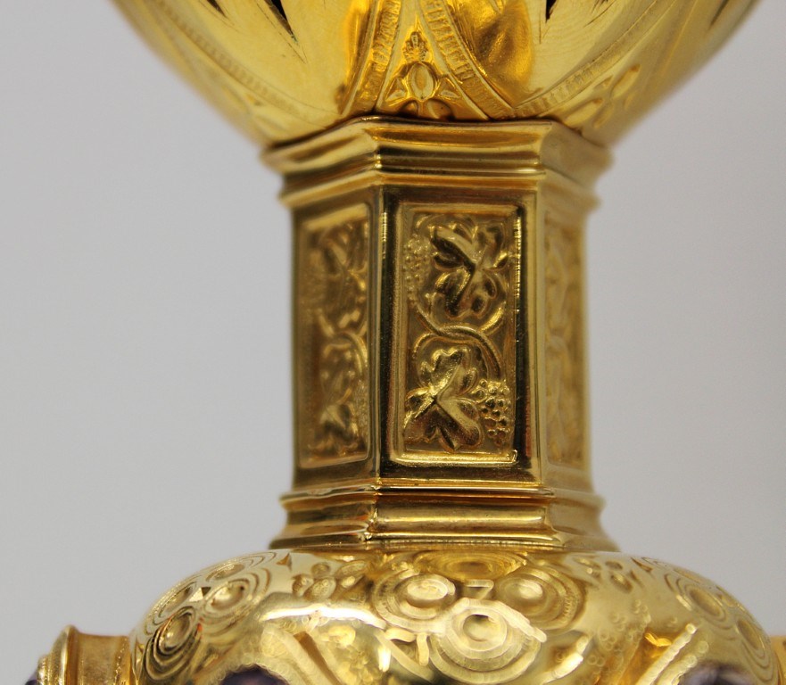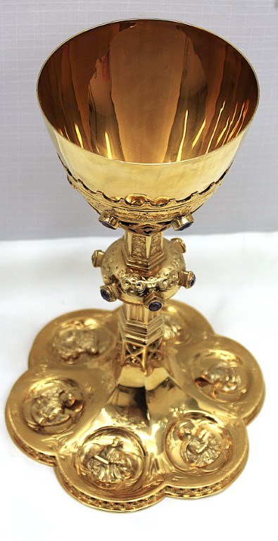 This is a 9-1/8" tall, full-sterling Gothic Style Chalice. It has a Scalloped base with Removable reliefs depicting the 4 Evangelists, Madonna and Child, and the Gloria Angel. There are 12 faux stones total - 6 along the calyx and 6 along the node. The calyx holds a stunning wheat and grape banding , and the chalice comes with a 5-1/2" diameter sterling scale paten.