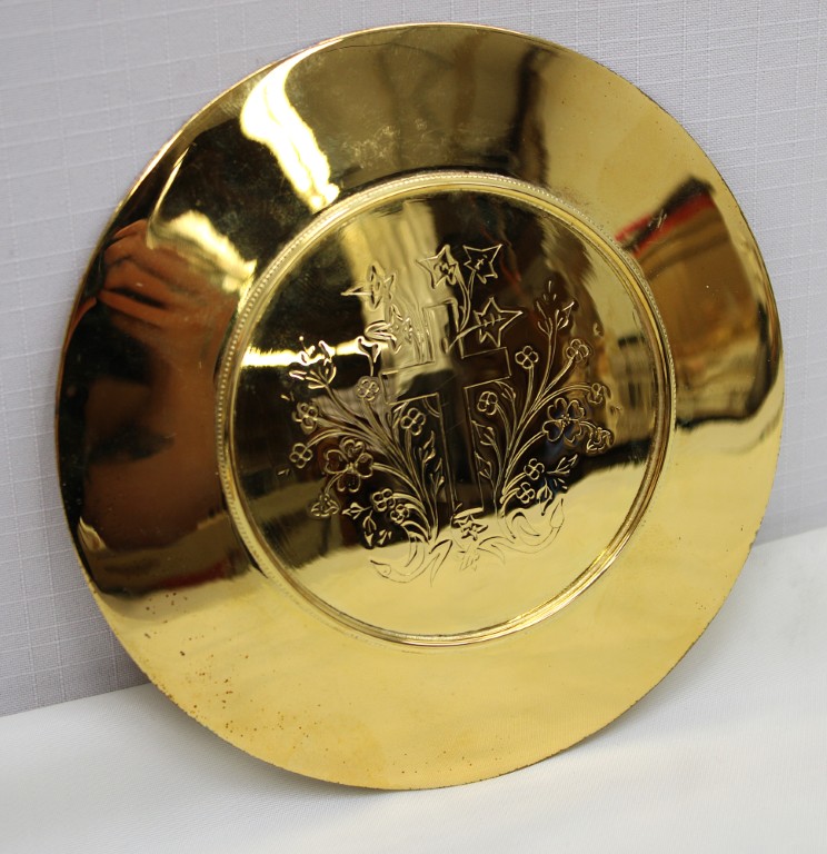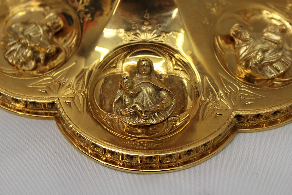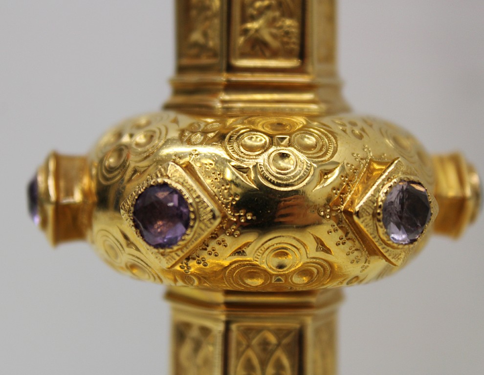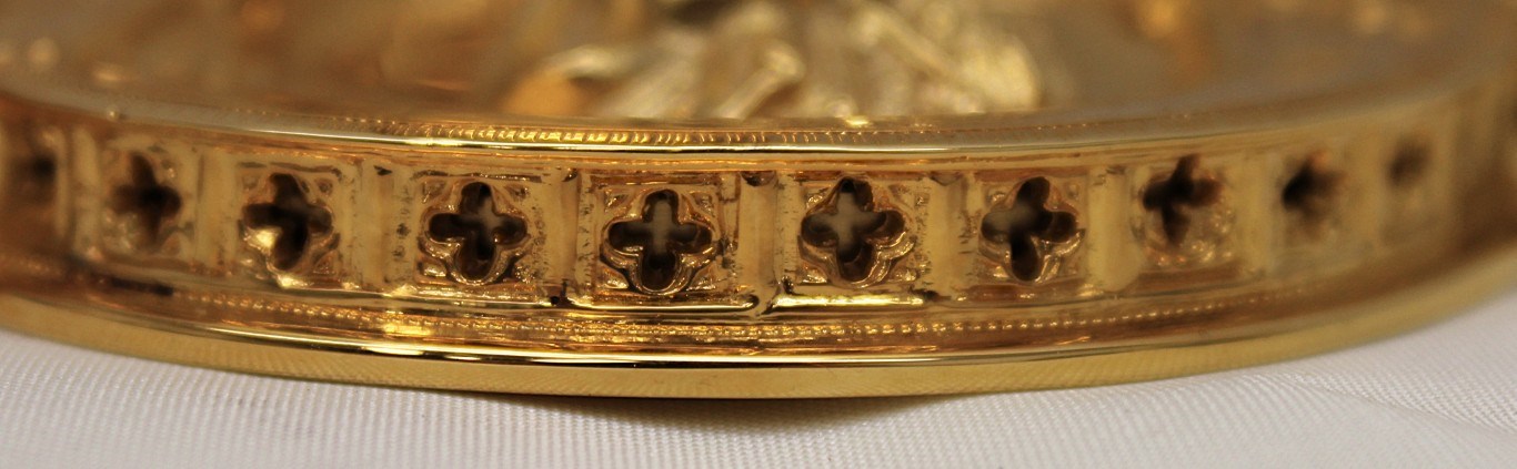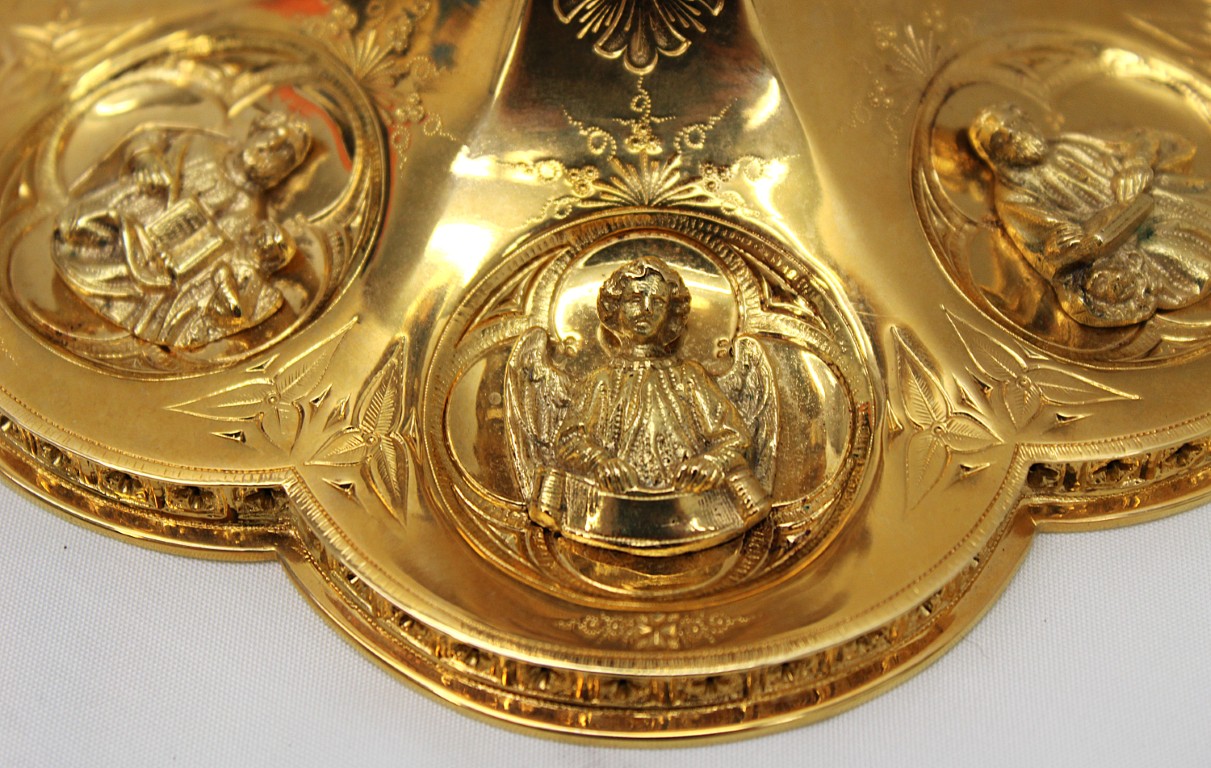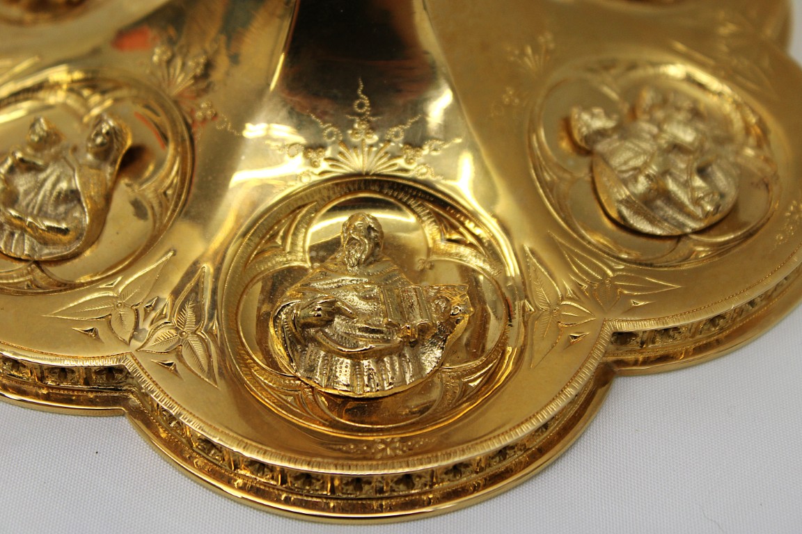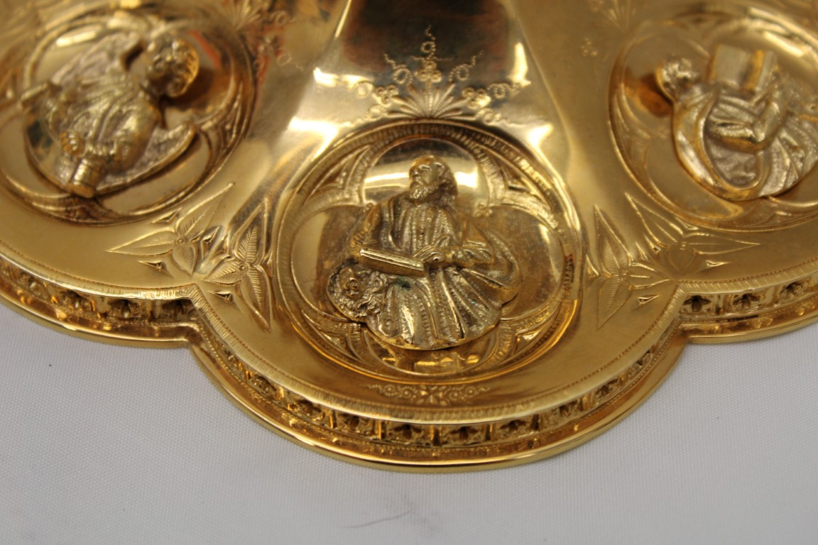 This is a 9-1/8" tall, full-sterling Gothic Style Chalice. It has a Scalloped base with Removable reliefs depicting the 4 Evangelists, Madonna and Child, and the Gloria Angel. There are 12 faux stones total - 6 along the calyx and 6 along the node. The calyx holds a stunning wheat and grape banding , and the chalice comes with a 5-1/2" diameter sterling scale paten.