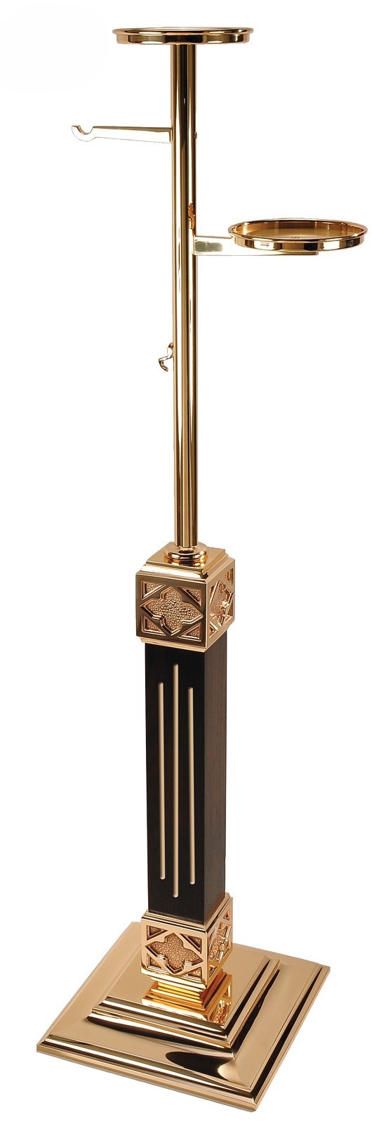 This stand is crafted in cast high‑relief bronze, featuring a square stepped base and a tall column accented with dark inlays and precise geometric detailing. Near the top, multiple bronze trays and hooks are integrated into the design, providing organized support for liturgical vessels or ceremonial accessories. Built for dependable sanctuary use, it combines durable construction with refined ornamental metalwork and a clean architectural profile.