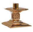 This refined candle holder made of cast Bronze stands with quiet dignity, its polished metallic surfaces catching the light in warm, luminous tones. The central column is adorned with crisp geometric detailing, lending a sense of sacred order and handcrafted precision. Resting on a beveled square base and crowned with a matching platform, it offers a graceful and enduring foundation for devotional illumination.
