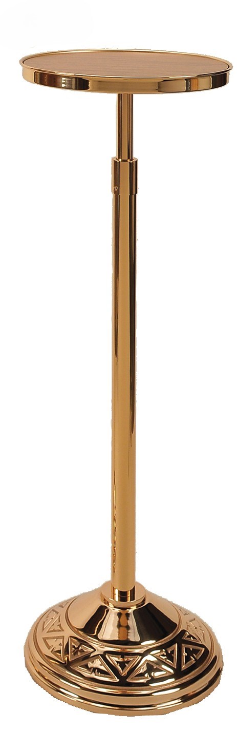 This slender adjustable pedestal rises with graceful simplicity, its polished gold surface catching the light in a warm, dignified glow. The circular top rests upon a tall, unbroken column that emphasizes height and elegance, drawing the eye upward. Anchored by an ornate, geometric‑patterned base, it offers a refined and versatile platform for devotional or decorative display.