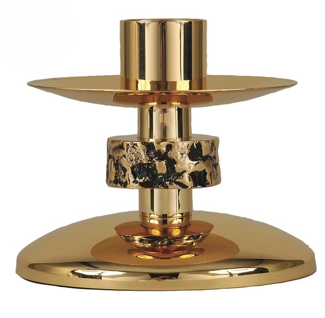 This solid brass candle follower features a brilliant polished finish accented by a textured mid‑band that adds visual depth and handcrafted character. Its broad, rounded base and balanced proportions ensure steady placement and a clean, even burn. Designed for enduring beauty and dependable service, it brings a refined yet distinctive presence to both traditional and contemporary sanctuary settings.
