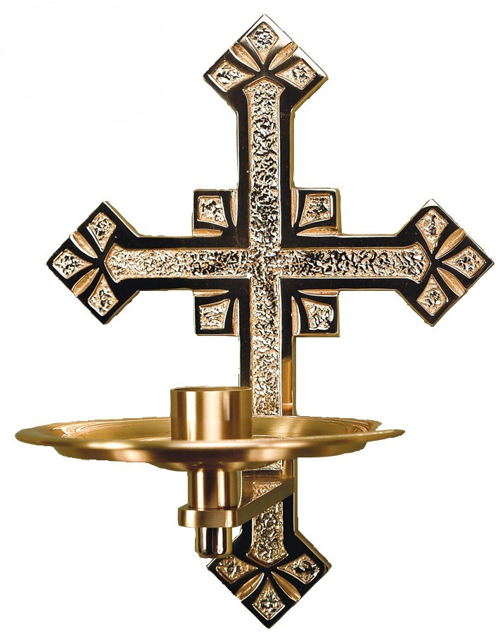 This wall‑mounted consecration candle holder is crafted in cast bronze and features a radiating cross design with textured surfaces that highlight its sculptural form. The relief work may be furnished in either a satin or high‑polish finish, allowing the cross pattern and central detailing to stand out with clarity and depth. Built for enduring liturgical service, it offers a dignified presence and dependable performance suited to sanctuaries, chapels, and devotional spaces.