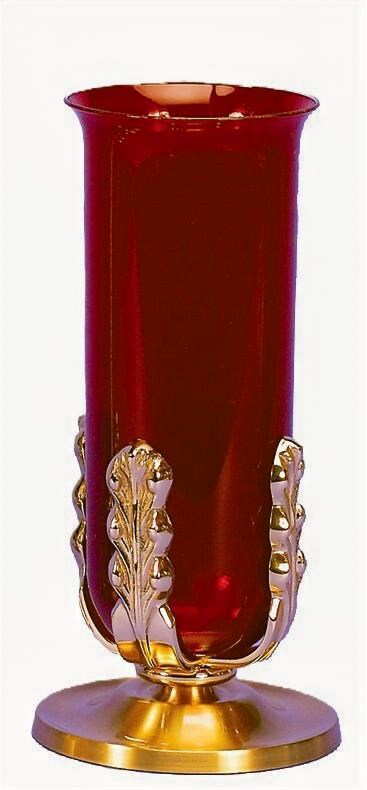 This altar sanctuary lamp is cast in textured bronze and illustrated in a brilliant high‑polish finish that enriches the sculpted leaf‑form supports rising around the ruby glass vessel. The tall glass cylinder rests securely within the ornate bronze framework, creating a luminous devotional focal point suited for perpetual light or sacramental presence. Its radiant finish and traditional craftsmanship offer a dignified, enduring presence for altars, chapels, and sanctuary settings.