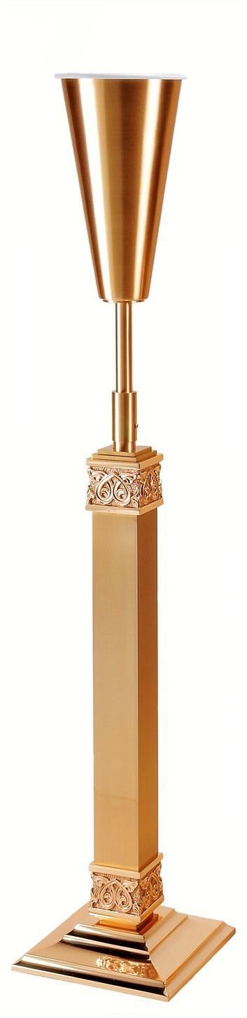 This stately standing sanctuary Vase features a gracefully flared cup rising from a sculpted column, all rendered in a warm, polished gold finish that reflects the dignity of the sacred space. The square pedestal base provides a commanding presence, enriched with subtle ornamental detailing that evokes classical liturgical design. A refined and enduring piece, it brings both beauty and solemnity to chapels, sanctuaries, and devotional settings.