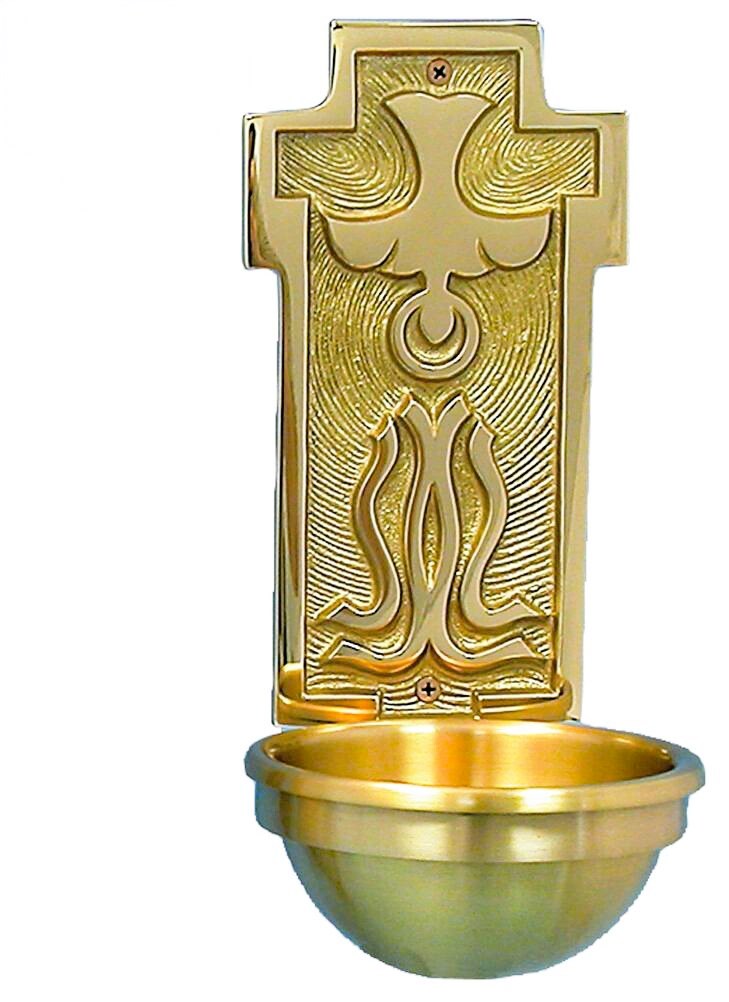 This striking holy water font is shaped in the form of a cross, its polished gold back plate adorned with a descending dove that symbolizes the gentle outpouring of the Holy Spirit. Flowing, flame‑like motifs radiate beneath the dove, creating a sense of movement and divine presence that enriches the entrance to any sacred space. A gracefully formed basin completes the piece, offering a dignified vessel for the sacramental waters of blessing.