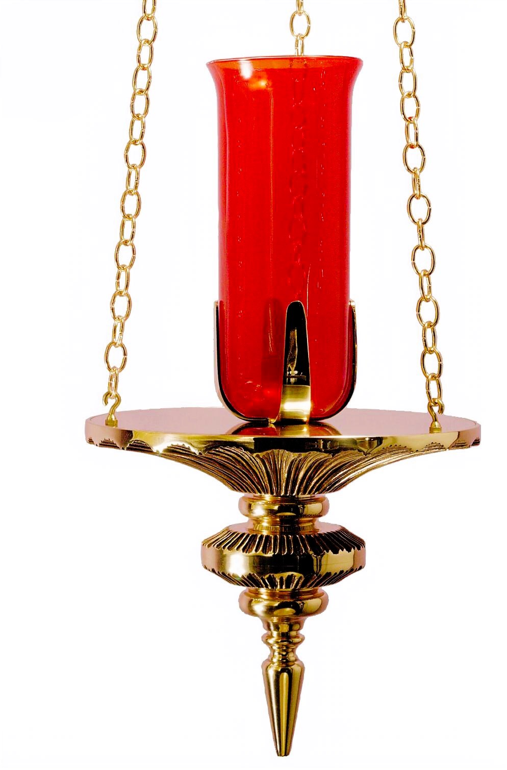 This hanging sanctuary lamp features a deep red glass vessel suspended by three finely crafted chains that rise to an ornate, fluted canopy. Its cast Bronze base is richly detailed with tiered and ridged accents, culminating in a graceful finial that lends visual balance and traditional beauty. When ordered without a bracket, the lamp is supplied with a three‑ or four‑way junction plate and 3 feet of chain for proper installation in the sanctuary.