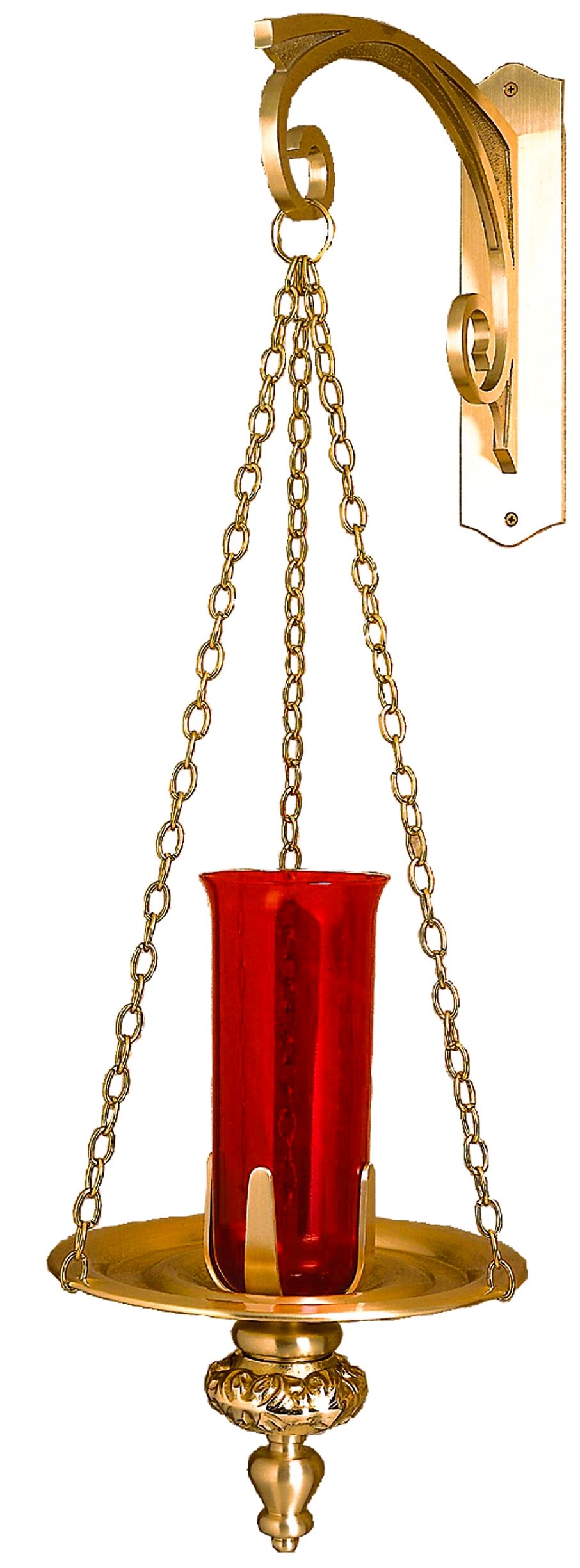 This hanging sanctuary lamp features a smooth red glass globe cradled within an ornately cast metal body enriched with intricate floral and geometric detailing. Two gracefully curved suspension arms join the chains above, creating a balanced and dignified silhouette that reflects traditional liturgical craftsmanship. Illustration shown with Globe No. 51.
