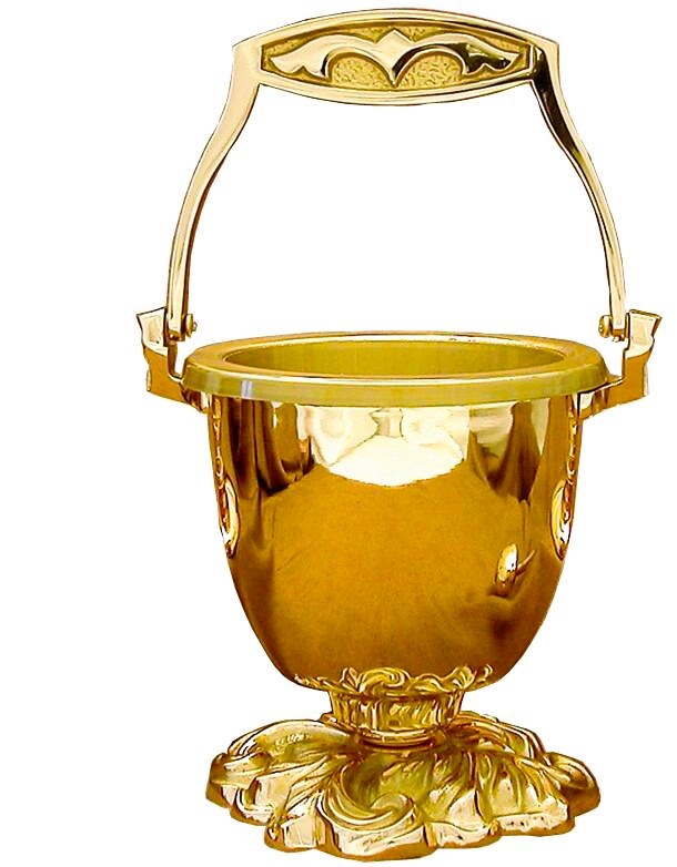 This ornate Bronze vessel is richly adorned with a sculpted, leaf‑inspired base that lifts the polished bowl with graceful, ceremonial presence. Its decorative handle, shaped with intricate curves and refined detailing, adds a sense of classical artistry and liturgical dignity. The mirror‑bright finish and elaborate contours create a radiant focal point suitable for sacred display or devotional settings.