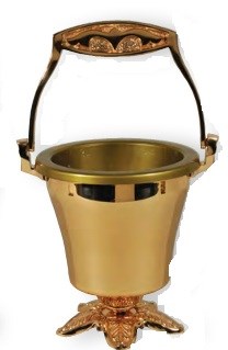 This polished Bronze holy water bucket features a smooth, radiant body elevated by an ornate, leaf‑inspired base that lends it a dignified ceremonial presence. Its decorative handle, shaped with refined curves and intricate detailing, offers a balanced and graceful hold for processional or ritual use. With its luminous finish and elegant contours, it stands as a distinguished vessel for carrying holy water during blessings.