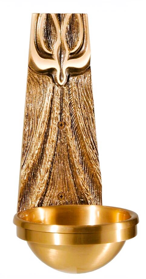 This cast bronze holy water font features a textured back plate crowned with a graceful symbolic motif, creating a dignified presence for any entrance or devotional space. Its polished basin is available in either a 3‑inch or 5‑inch bowl, each supplied with a clear plastic liner for practical maintenance and long‑term use. The warm bronze finish and refined contours lend the piece a reverent beauty suited to traditional liturgical settings.