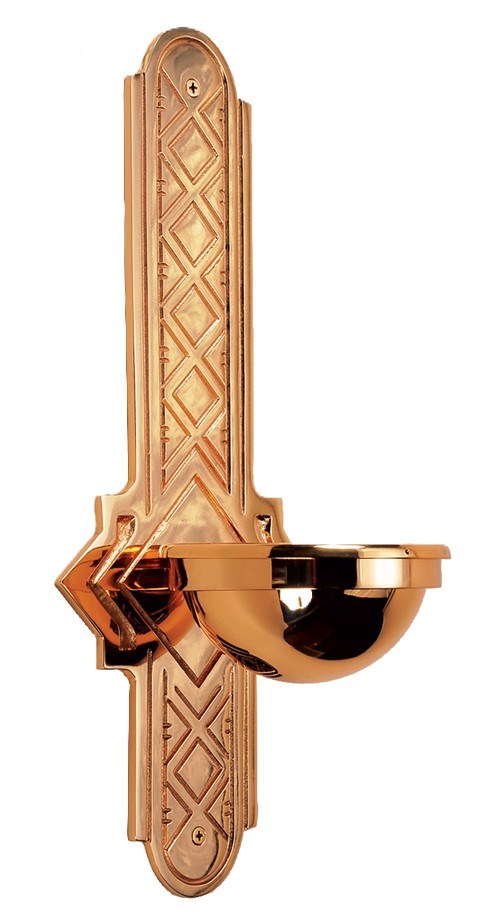 This cast bronze holy water font features an elongated, engraved back plate with refined geometric detailing that lends a dignified architectural presence to any entrance or devotional space. Its polished basin is offered with either a 3‑inch or 5‑inch bowl, each supplied with a clear plastic liner for practical maintenance and long‑term durability. The warm bronze finish and elegant contours create a timeless, reverent accent suited to traditional liturgical settings.