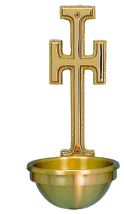This cast bronze holy water font features a dignified back plate crowned with a finely sculpted patriarchal cross, its polished contours creating a warm and traditional devotional presence. The basin is offered with either a 3‑inch or 5‑inch bowl, each supplied with a clear plastic liner to ensure practical upkeep and long‑term durability. With its luminous bronze finish and refined detailing, it provides a timeless and reverent accent for any church entrance or chapel setting.