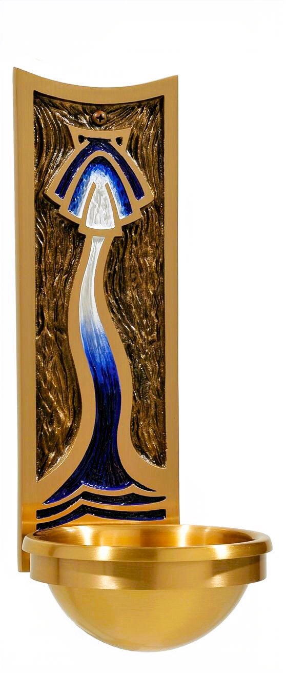 This cast bronze holy water font features a richly textured back plate accented with flowing enamel‑style hand painted blue and white detailing, creating a warm and expressive devotional presence. Its polished basin is available with either a 3‑inch or 5‑inch bowl, each supplied with a clear plastic liner for practical upkeep and long‑term durability. With its luminous bronze finish and refined contours, it offers a reverent and visually distinctive accent suited to any church entrance or chapel setting.