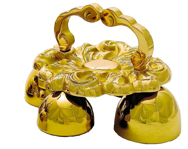 Crafted from specially cast bronze, this elegant altar bell set features a richly patterned crown and sweeping dual handles that lend it a dignified ceremonial presence. Its polished bowls respond with a warm, resonant tone that enhances the solemnity of the liturgy. Designed with both beauty and function in mind, it stands as a refined expression of devotional craftsmanship.