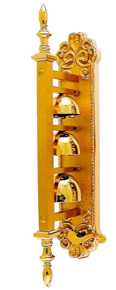 Cast from specially formulated bronze, these sanctuary bells feature a completely concealed operating mechanism that allows each chime to sound with smooth, effortless precision. Their ornate frame, crowned with traditional finials and polished bell domes, brings a dignified, classical presence to the sanctuary. Built for quiet reliability and ceremonial clarity, they provide an elegant and unobtrusive means of marking sacred moments within the liturgy.
