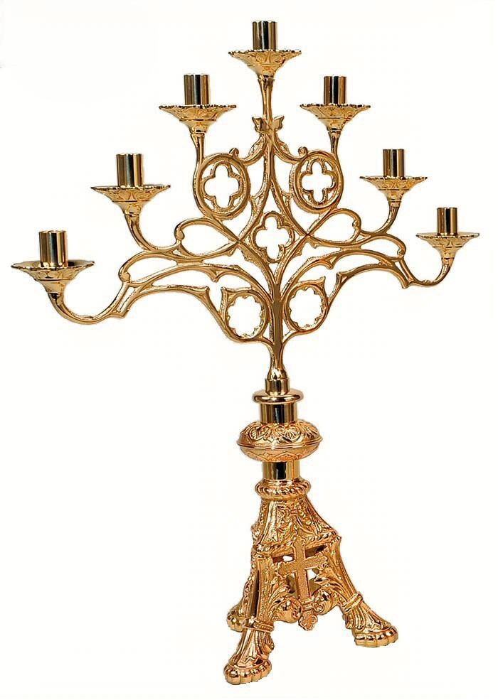 This seven‑branch candelabrum is crafted in cast high‑relief bronze, its scrolling arms, quatrefoil accents, and sculpted base rising with crisp dimensional clarity. A refined interplay of high‑polish brilliance and satin‑bronze warmth enhances the flowing contours of each branch, creating a radiant presence under sanctuary lighting. Resting on three graceful feet, it stands as a dignified and enduring symbol of sacred illumination.