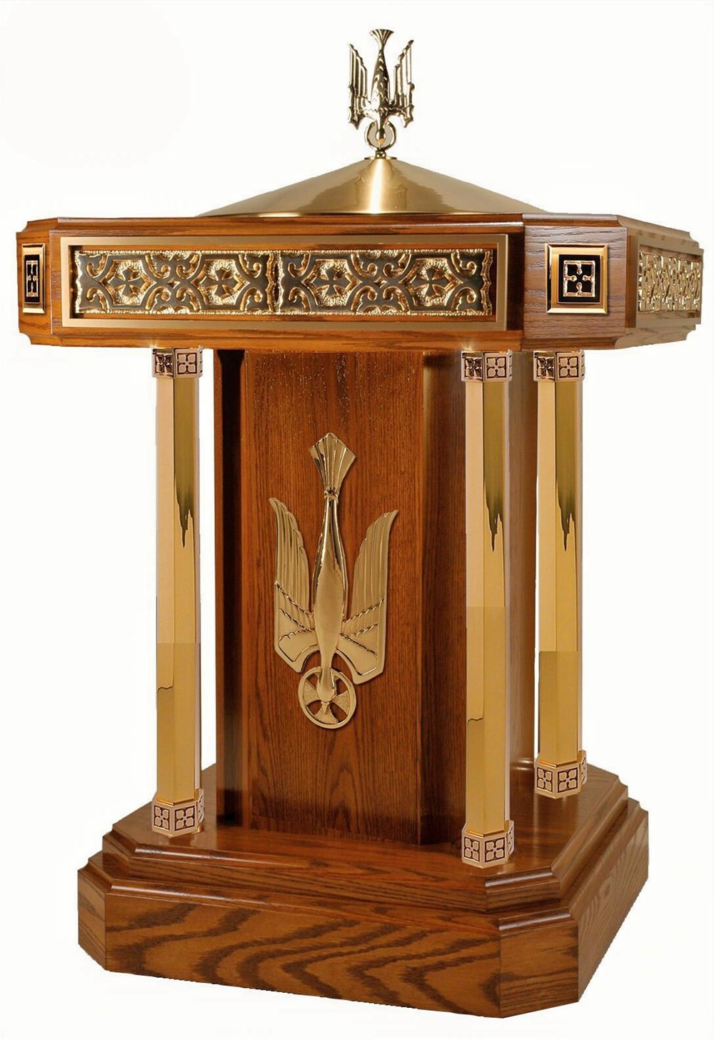 This Baptismal Font is crafted with dignified architectural lines, combining warm oak tones with refined metal accents to create a focal point of reverence within the worship space. Its balanced proportions and elevated basin present the sacrament with clarity and grace, inviting the faithful into the mystery of new life. Designed with enduring craftsmanship, it offers a timeless presence suitable for both traditional and contemporary sanctuaries. Illustrated in Custom Stain on Oak Wood.