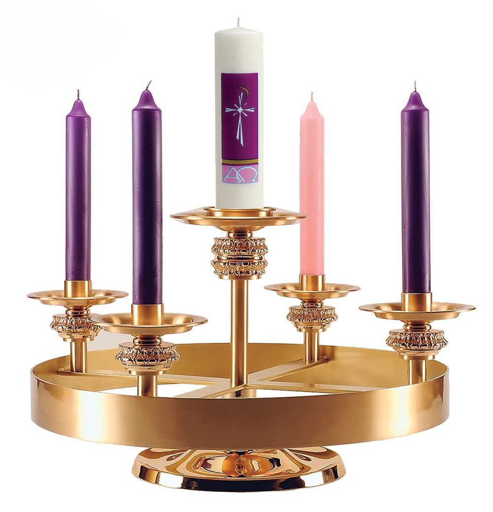The adjustable Advent wreath rises with quiet majesty, its gold‑tone framework lifting the candle ring to the desired height with smooth, dignified precision. Cast ornamentation and polished contours catch the glow of the purple, rose, and central white Christ candle, creating a luminous focal point for the season’s unfolding prayer. Elevated in form and reverent in presence, it becomes a graceful companion to the sanctuary’s anticipation of Christmas.